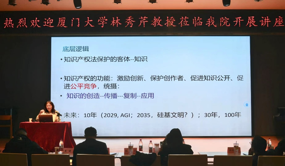 报告厅举行。厦门大学知识产权研究院教授林秀芹应邀作“人工智能与知识产权的未来”主题讲座。学院副院长汤道路,徐州知识产权法庭庭长李为帆,北京浩天(徐州)律师事务所主任夏建立、律师吴平方及法学系百余名师生参与讲座。