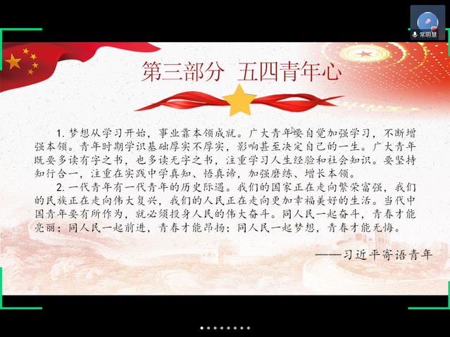 5月23日下午3时,法学18-2班于腾讯会议开展“热血存于心,五四践于行”线上团日活动,本次团日活动由常明慧同学主持,法学18-2班全体成员积极参与。