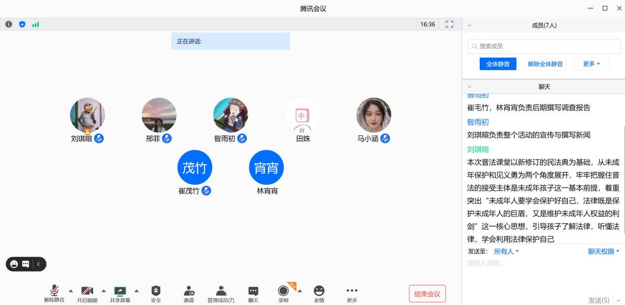 8月26日上午8时,人文学院“云”上民法典普法宣讲团成员在腾讯会议线上集合,开展““云端”走进民法典,探索普法新模式”暑期社会实践活动,并进行搜集民法典资料、录制线上普法的视频以及制作普法课件等等正式普法宣讲前的准备工作,普法宣讲团的全体七名成员线上参与实践活动。