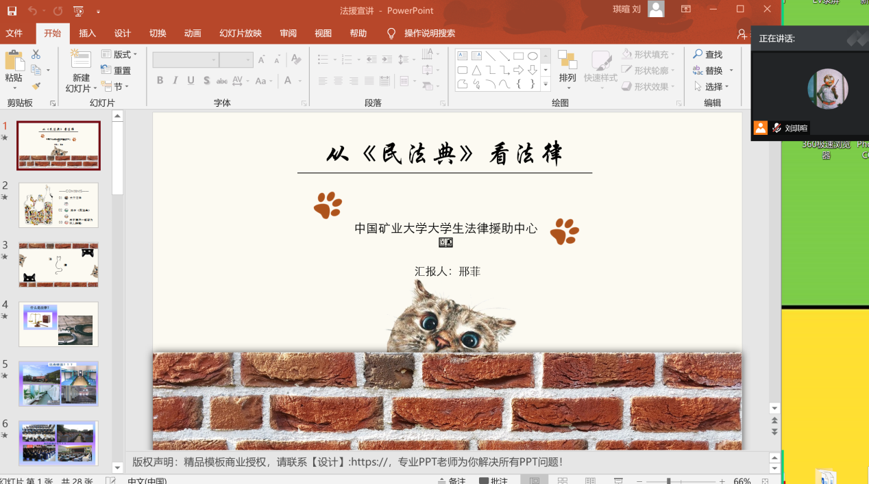 研究生支教团的成员为大家介绍了本次普法对象——广西壮族自治区田东县思林镇扶贫安置点留守儿童们的大致情况,便于大家有针对性地准备普法内容和优化宣讲形式。接着,团队成员田姝、马小涵、邢菲开始线上“云课堂”的视频录制,同时团队成员共同协助搜集资料和相关内容制作,将复杂的法律条文用简单易懂的语言和生动形象的漫画展示出来。最后,负责人昝雨初将最终成果统筹整理,并且进行二次的校对和检查,为第二天的线上普法宣讲和普法视频播放作充分的准备和模拟线上演练。在团队成员的共同努力下,“云”上民法典普法宣讲团顺利完成了线上普法宣讲的前期准备工作。