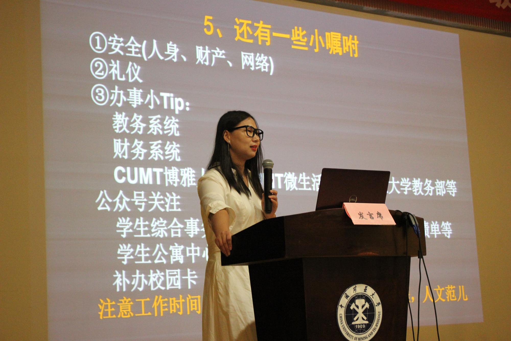 郭丽婉老师通过视频的形式引出此次年级大会的主题。郭老师表示:“通过视频我们可以看出,人生的每个阶段都会有自己的难题,但是随着时间的流逝以及自身的努力,每个问题都会找到答案。”接着,郭老师从自主承担责任的范围、课堂、教师、考试、分数五个方面向同学们展现了大学的特点,并重点介绍了辅导员的工作职能,同时就校规校纪和安全教育方面进行了重点强调,告诉同学们要有规则意识和安全意识。