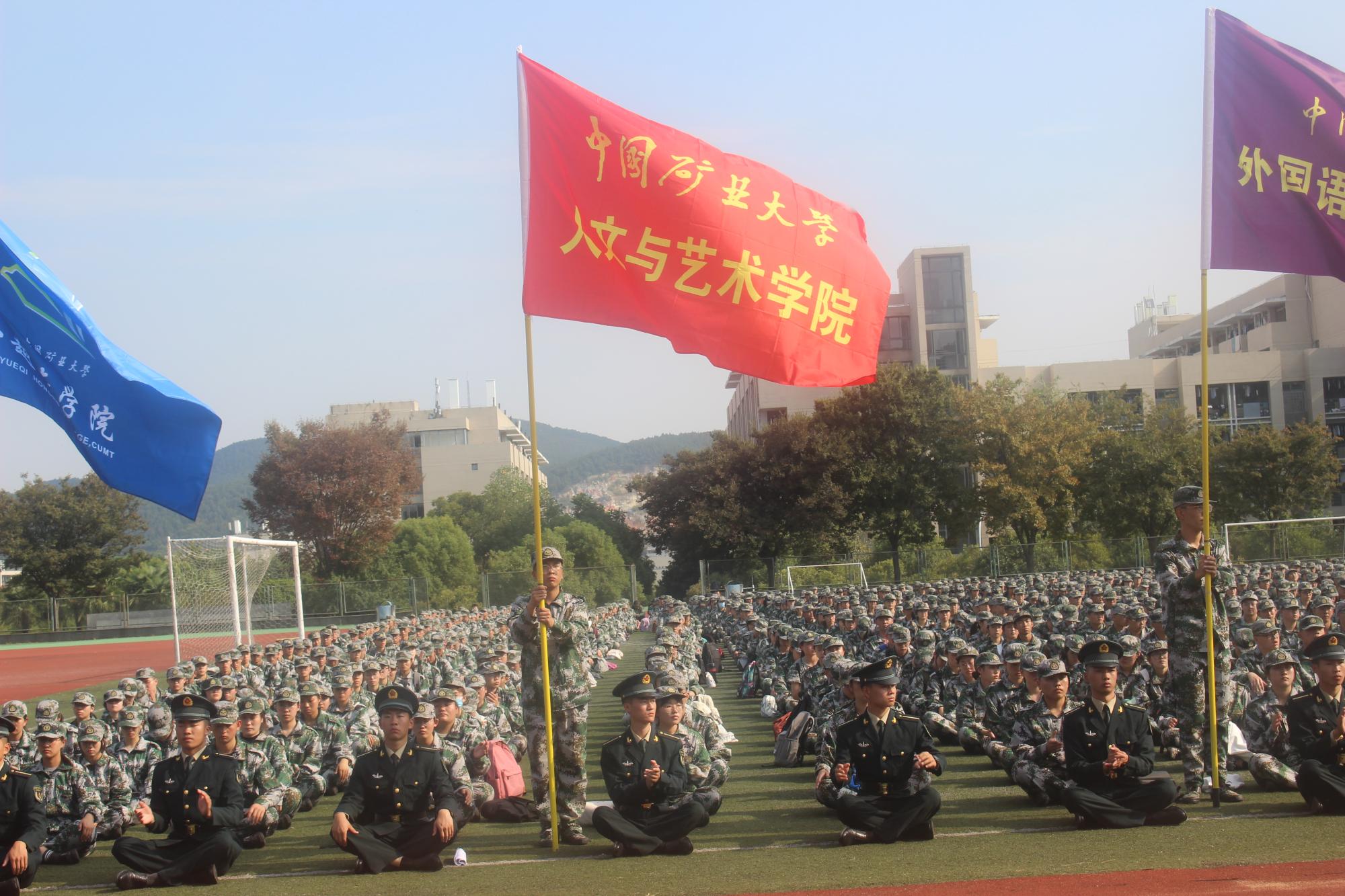 新生排成四列纵队,整齐划一、严肃认真,聆听着老师、教官们的指导与勉励。动员大会结束后,人文新生由辅导员带领,有序地回归训练场地继续训练。