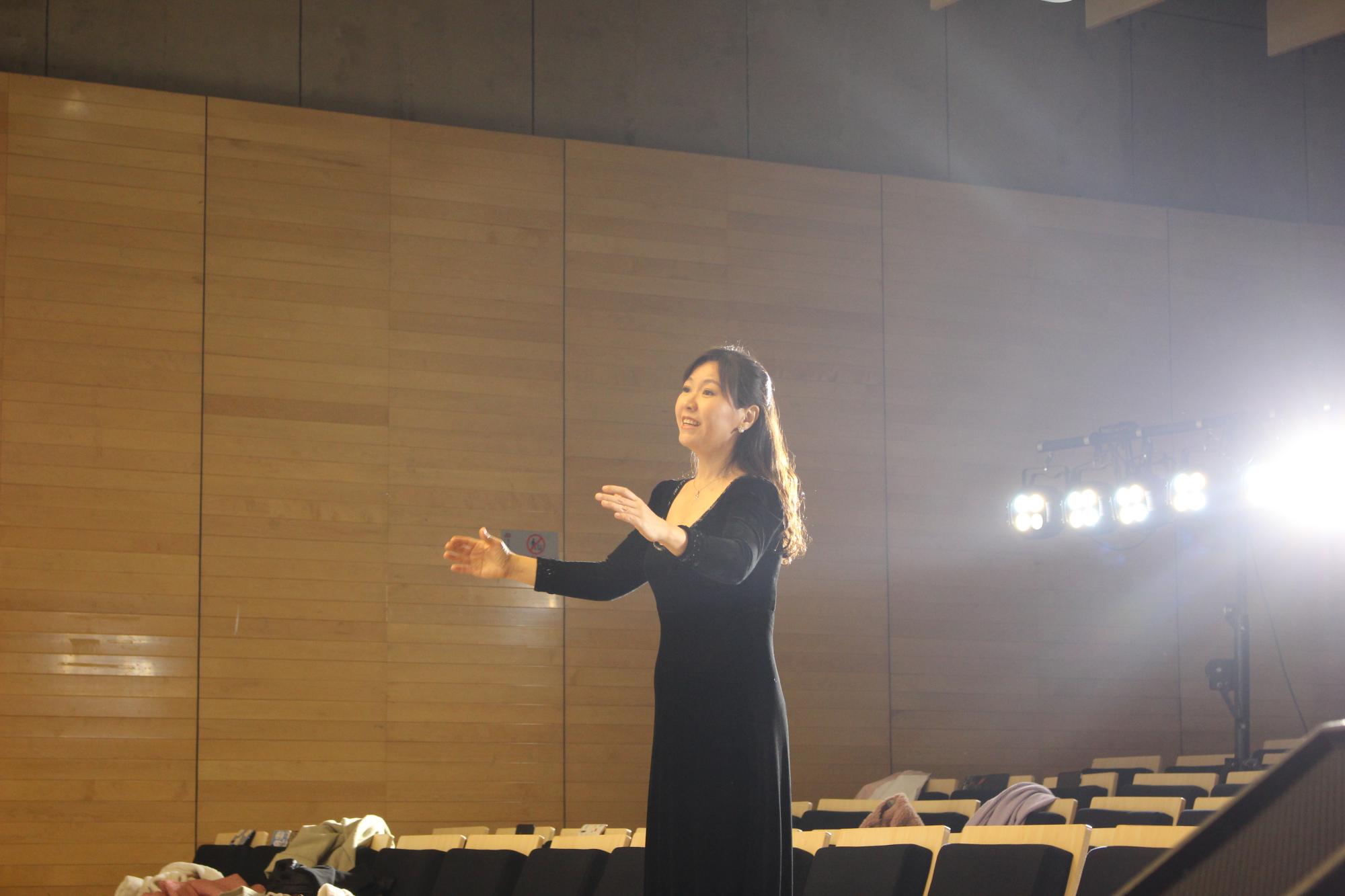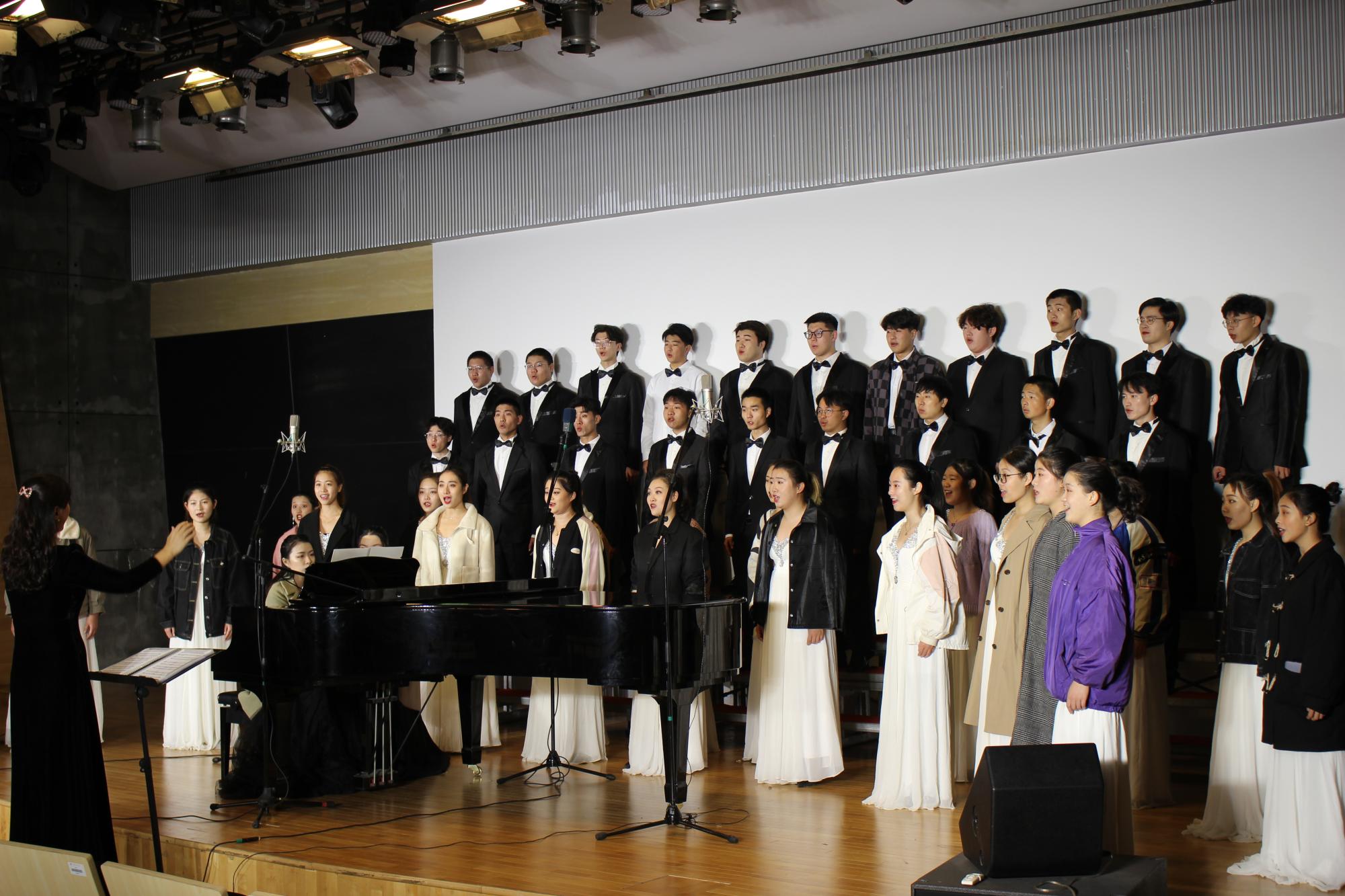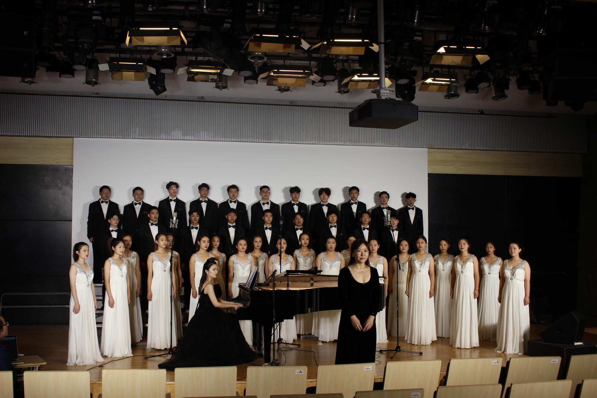 从节目彩排到正式录制,朱文老师和徐登峰老师就台上人员占位、人员间隔、演出空间的紧密程度等几个方面,对参演学生进行指导,以达到演出的高标准要求。朱文老师在一遍节目录制后,针对演出过程中出现的问题进行修正与改进,针对每个演出人员的神态与表情等细节部分进行调整,以保证录制效果。徐登峰老师全程调整节目的录制,在帮助现场录像的同时,根据节目内容、表达内涵、整体风格以及节目排练和最终录制前出现的问题,结合自己的专业知识,提出指导意见。刘子昱老师则从观众视角分析音乐的传达与力量的感染,并点明演出过程中存在的问题,提高录像呈现的艺术性。张如成老师在现场灯光与画面美感等方面提出相关意见,强调在空间上要体现层次感,展现出每一位演出者的风采。录制过程中参演同学密切配合,各司其职。两位钢琴演奏者更是默契十足,男女高低声部此起彼伏,黑白搭配的服装给人视觉冲击,美丽妆容亦给人心灵享受。