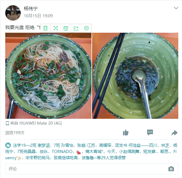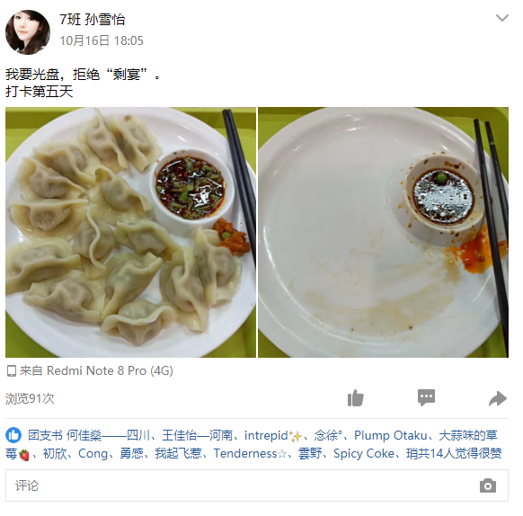 本活动形式为线上打卡,参加活动的同学每天在空间上传两张照片,第一张为吃饭前的盘子照片,第二张为吃饭后的盘子照片,且第二张照片不可在餐盘回收处拍摄,以及规定的文字内容——我要光盘,拒绝“剩宴”,打卡第X天,并于每日24:00前将空间截图发到群相册中。活动时间14天内打卡满7天(无需连续)获得1⼩时志愿时长,打卡满14天获得2小时志愿时长。