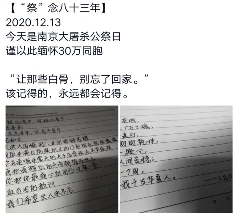 12月10晚,承办部门公益部安排相关人员进行扫楼宣传,并邀请同学进入活动群,在同学们了解活动性质与活动细则后,报名参与的志愿者们便依据活动安排开始进行相关的作品制作。志愿者们踊跃报名,创作热情十分高涨。12月13日,志愿者纷纷提交了纪念南京大屠杀八十三周年的诗歌、绘画、手工制品等“祭”念作品,经公益部审核后在麻豆av