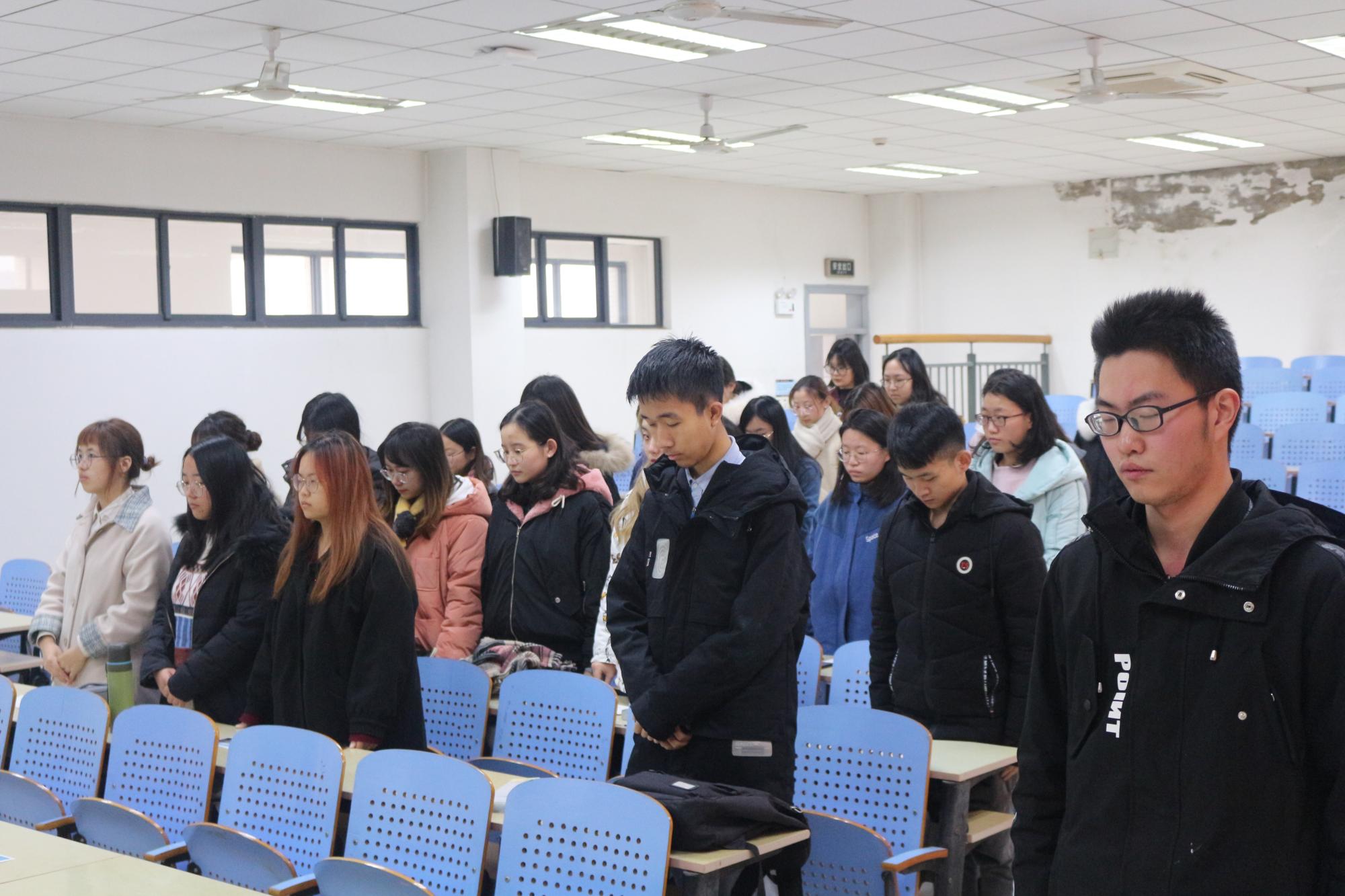 首先,全体同学观看了12月13日上午十时零一的南京街头默哀视频并观看了南京大屠杀历史资料视频,之后由刘振乾分享参观侵华日军南京大屠杀遇难同胞纪念馆的感受,他介绍了雕塑——“家破人亡”,并讲述参观者留言册的故事。接下来八组的成员分享自己对于南京大屠杀死难者国家公祭日的感想,殷懿蕃说:“我们不能忘记历史,我们要将那段屈辱的历史警示传达给每一代。”忘记历史就意味着背叛,而铭记不等于永远仇恨,正如杨欣然的发言:“国家公祭日的设立不仅是对死难同胞的缅怀纪念,对死难者家属微薄的慰藉,更是为了让施暴者和受害者反思历史、铭记历史;尊重生命、敬畏生命;珍视和平、维护和平。”曾经走过的苦难,最终都会成为中华民族前进的力量。其次,七组的刘树环、向秭璇和汪启晖朗诵了《南京,我的南京》,然后全体同学起立,同默哀视频一起,向南京大屠杀死难者和所有在日本帝国主义侵华战争期间惨遭日本侵略者杀戮的死难同胞致哀。最后,刘振乾总结道:军事法庭早已对南京大屠杀惨案作出定性和定论,是非曲直,昭然具在,铁证如山,不容篡改。我们反对战争、反对军国主义、法西斯主义,而不要阻碍中日人民之间的友谊。历经战争磨难的中国人民更加懂得和平的珍贵,我们坚信,“正义必胜,和平必胜,人民必胜”。