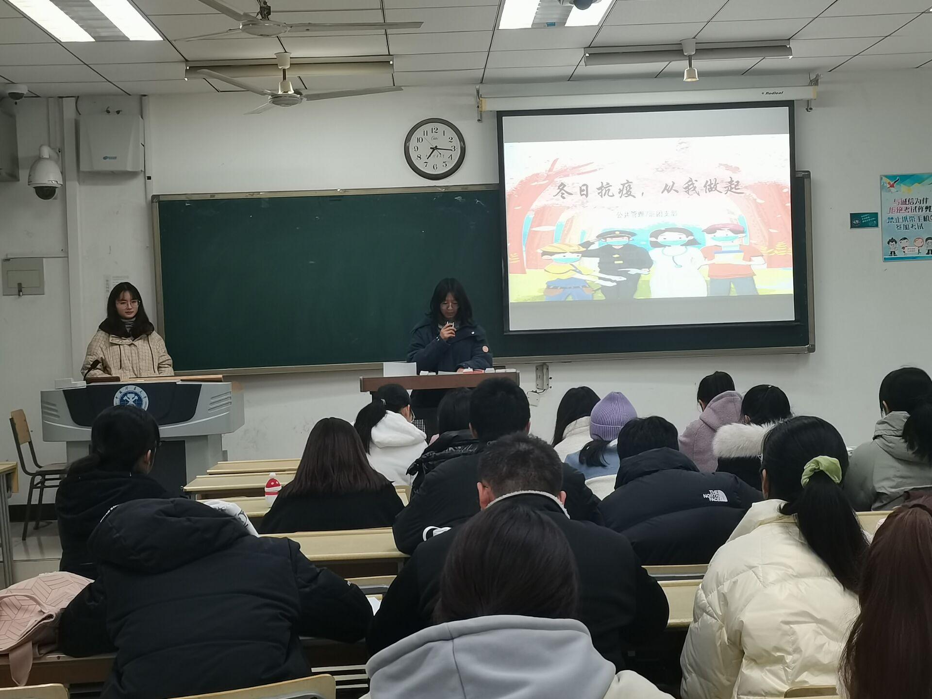 会议伊始,王佳慧进行发言,她说道:“凛冬将至,霁月长明。经过长达一年的抗疫,国内的情况有了极大的好转。但我们仍不能就此松懈,今天我们就冬日大学生如何抗疫为主题召开此次班会。”在冷依璇、刘金泉两位同学就目前国内外疫情形势做简短的介绍后,同学们共同观看两段冬日抗疫相关视频,对冬日抗疫有了更深的理解。接着,同学们写下冬日抗疫承诺书,黄志润同学作为全班代表宣读了自己的抗疫承诺书。