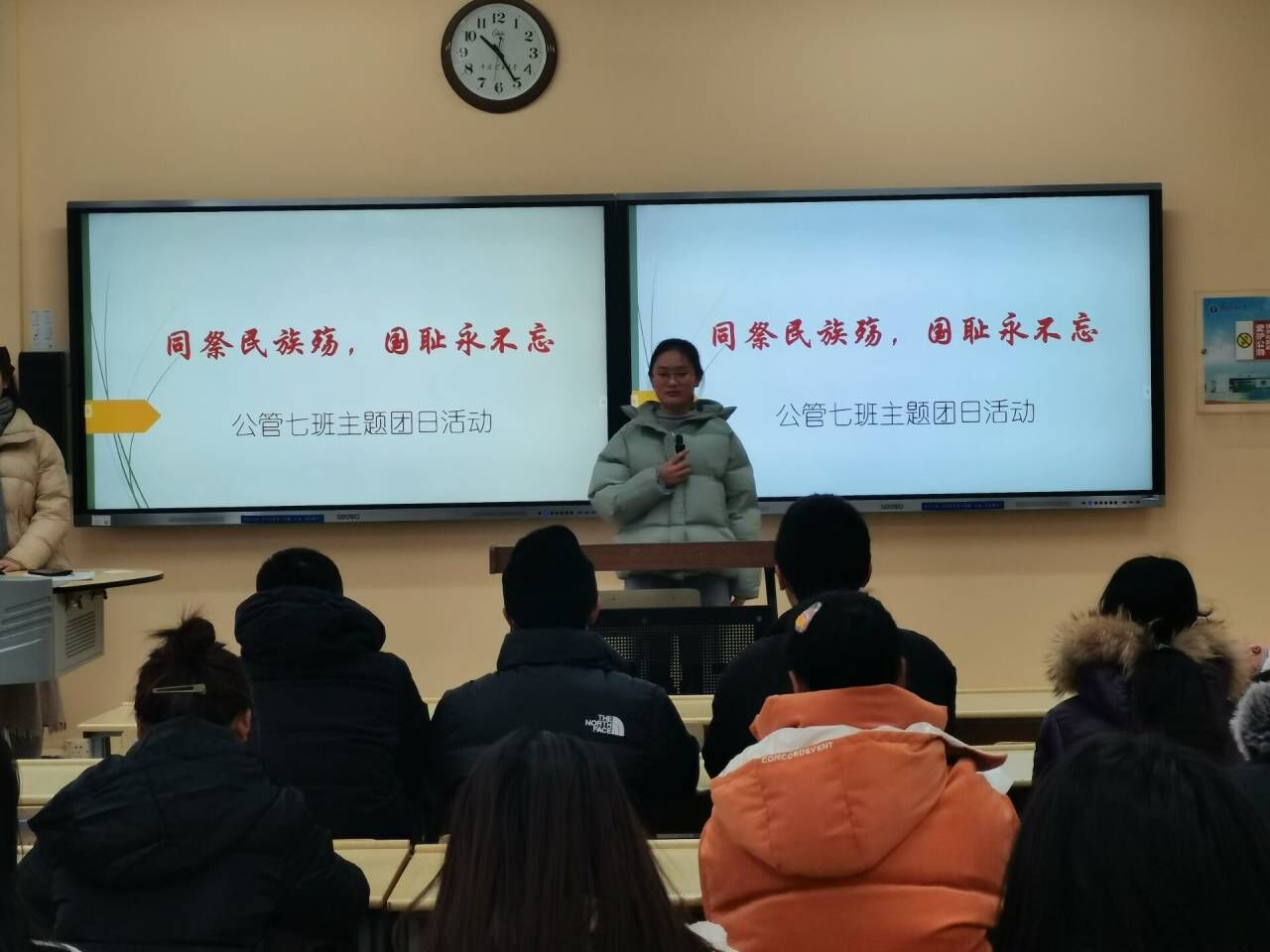 公管类2020-7班于公教区博4B102召开“同祭民族殇,国耻永不忘”主题团日活动。本次团日活动由团支书王佳慧主持,全班同学到场参与。