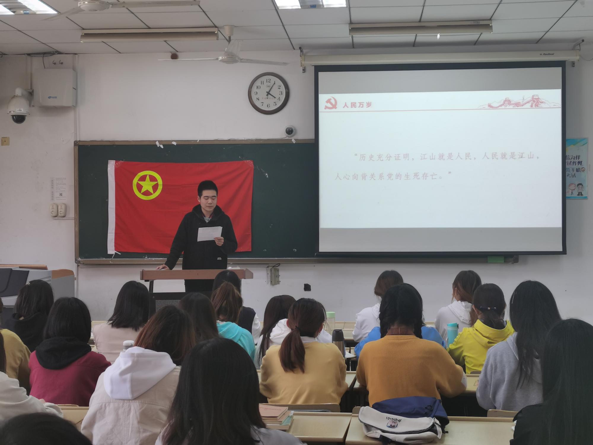 最后,刘振乾作为团支书向班级同学提出三点要求:坚定信念,不忘初心;保持定力,影响他人;学好本领,担好责任。希望同学们能严格要求自己,成为有利于社会,有益于人民的人。
