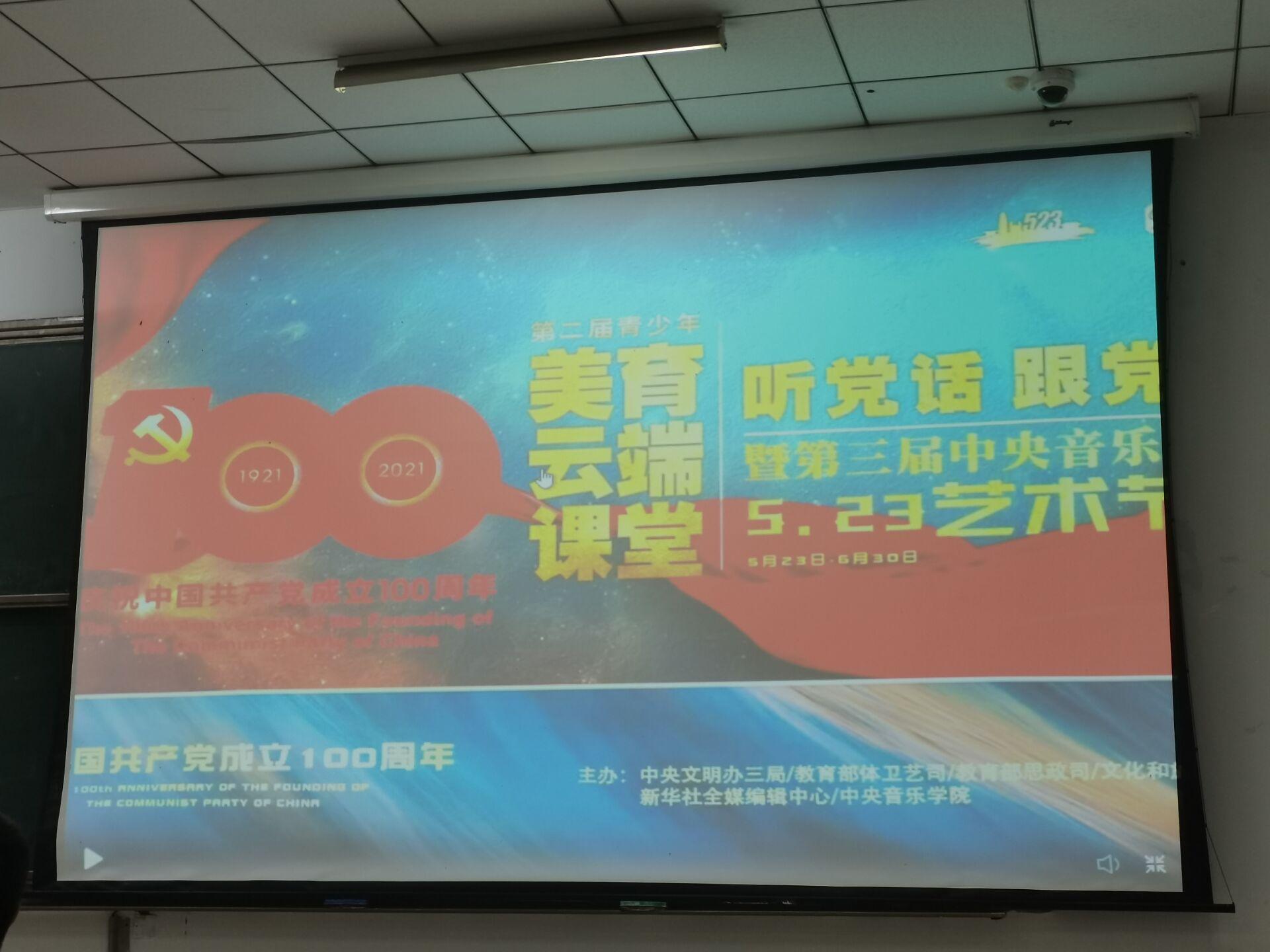活动以视频播放的形式展开,通过带有浓浓爱国情怀的歌曲、视频带同学们领略中央音乐艺术节的特色,回顾党带领中国人民走过了百年光辉历程。此次音乐节的展示也紧紧围绕着建党百年展开,选取百年历程中具有重大意义的事件,彰显党坚持为人民奋斗不止的伟大奉献精神。当右拳举过头顶,宣誓“我志愿加入中国共产党...”,从那一刻起,身为党员肩上便肩负起了使命和担当。歌曲《从那一刻起》让我们体会到一位位党员的责任担当,以及时刻献身革命的决心。可上九天揽月,可下五洋捉鳖,谈笑凯歌还,歌曲《水调歌头·重上井冈山》展现了党作出领导人民建立第一个革命根据地伟大战略决策的重要意义。家住彩云间,四季花开艳,山路弯到海,锦绣铺上天,歌曲《家在彩云间》反映出人民对于美好生活的向往。而百年奋斗到如今,党领导我们全面建成小康社会,满足了人们对于彩云间生活的向往。