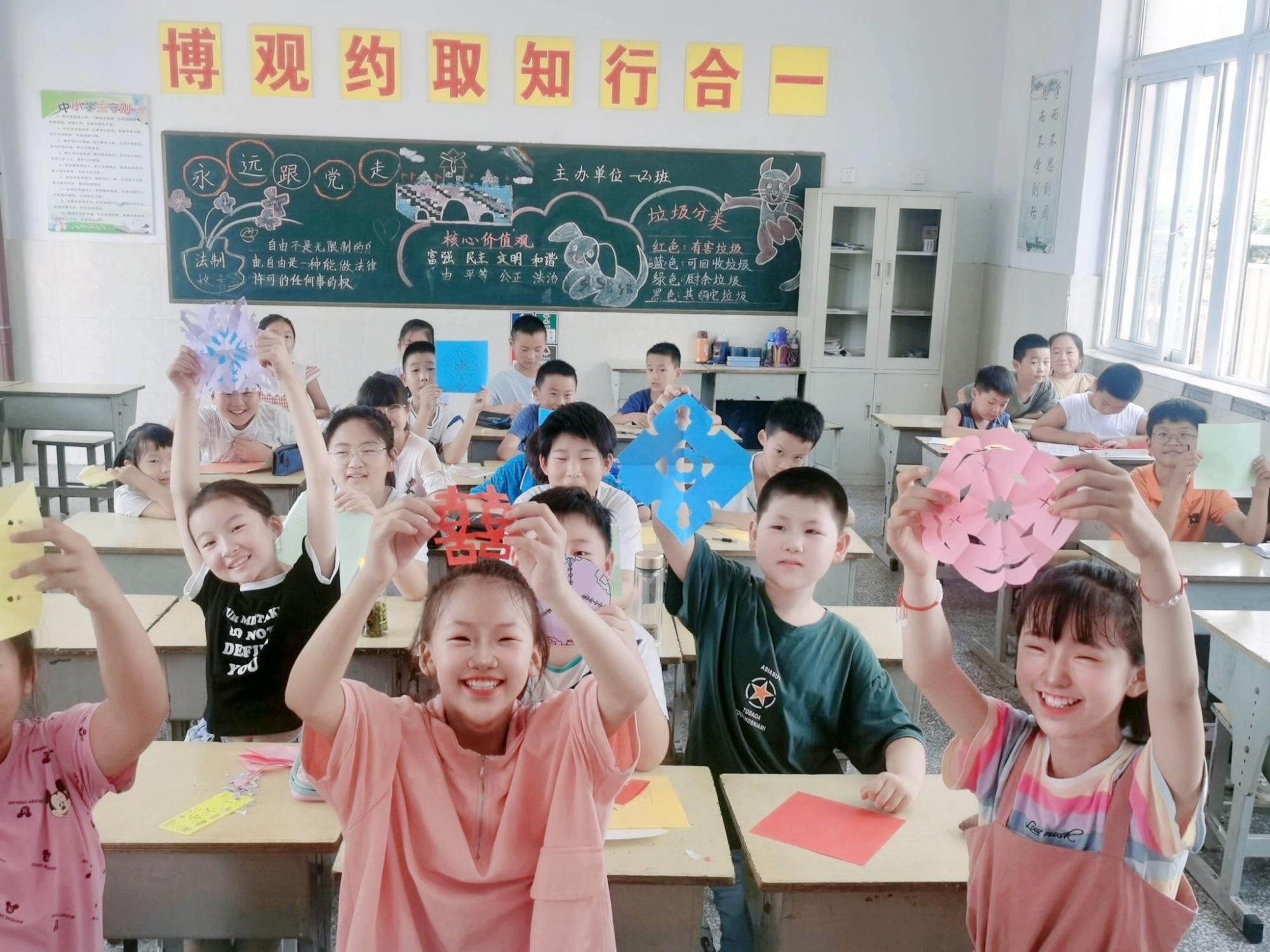 7月22日,“童享阳光,青春护航”活动团队在徐州市汉王镇铜山汉王小学开展第四天的授课。本地区活动由朱宣颖负责,与万笑颜共同负责授课。本日的课程安排为“爱国教育”、“趣味绘画”、“纸墨我心”以及“课业辅导”。