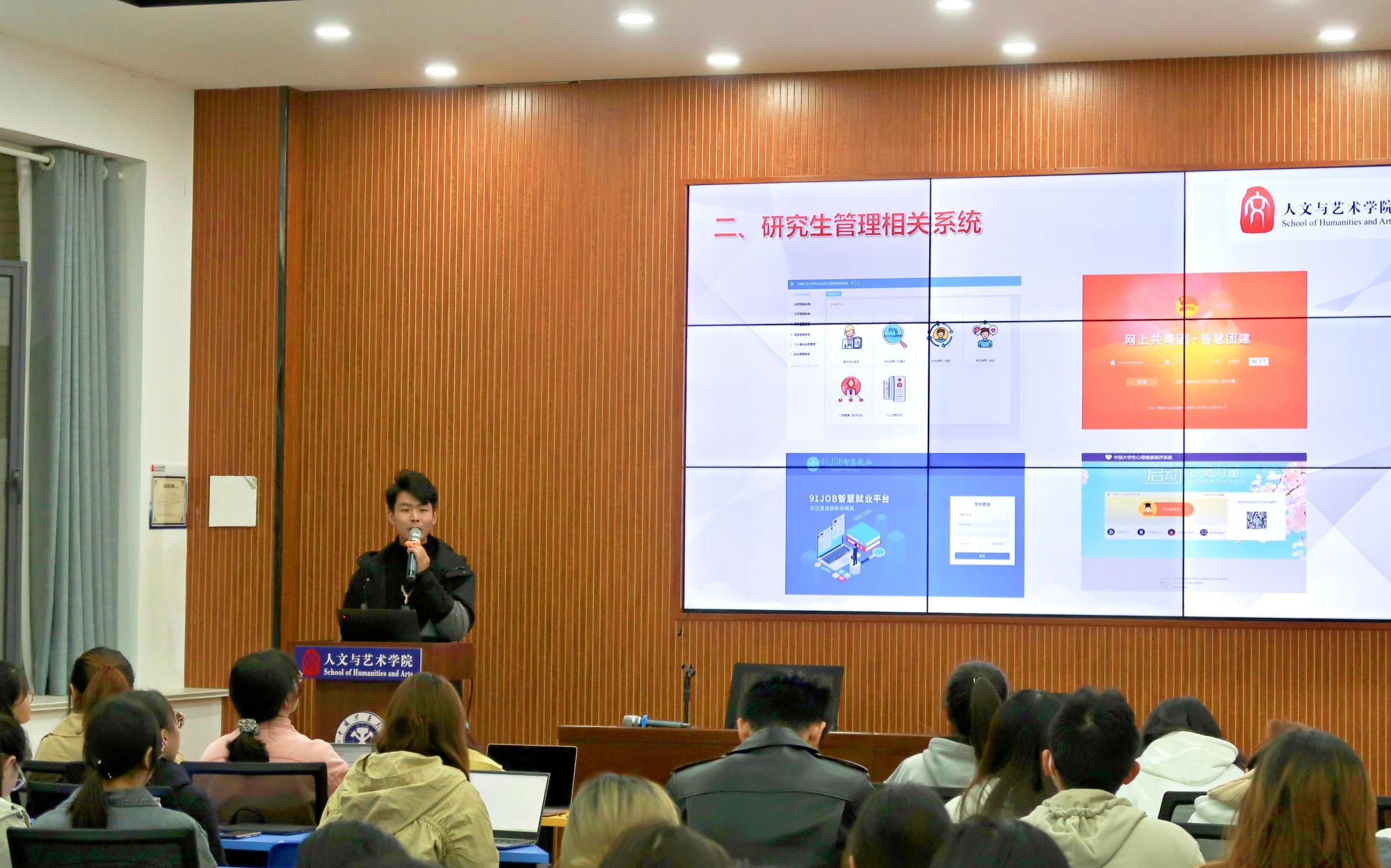 兼职辅导员杨安华向同学们普及了研究生行为准则、安全教育、党团建设等相关信息,使新生更加明确自己在校的行为标准和规范。随后兼职辅导员杨安华给同学们提供了有关生活服务和心理健康的教育引导,并对21级全体同学进行了现场心理测评,以尽可能全方位地关照同学们的日常生活。