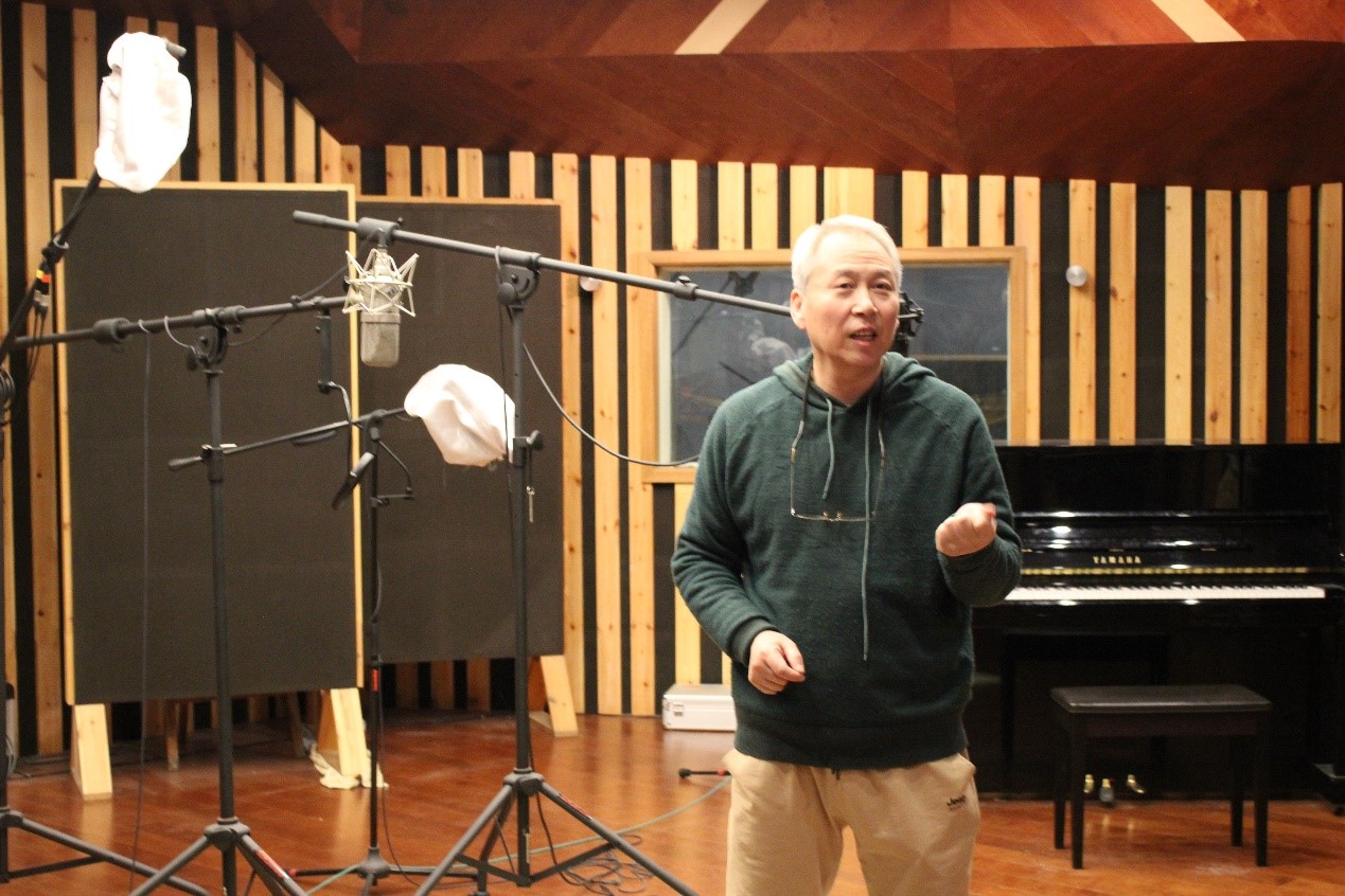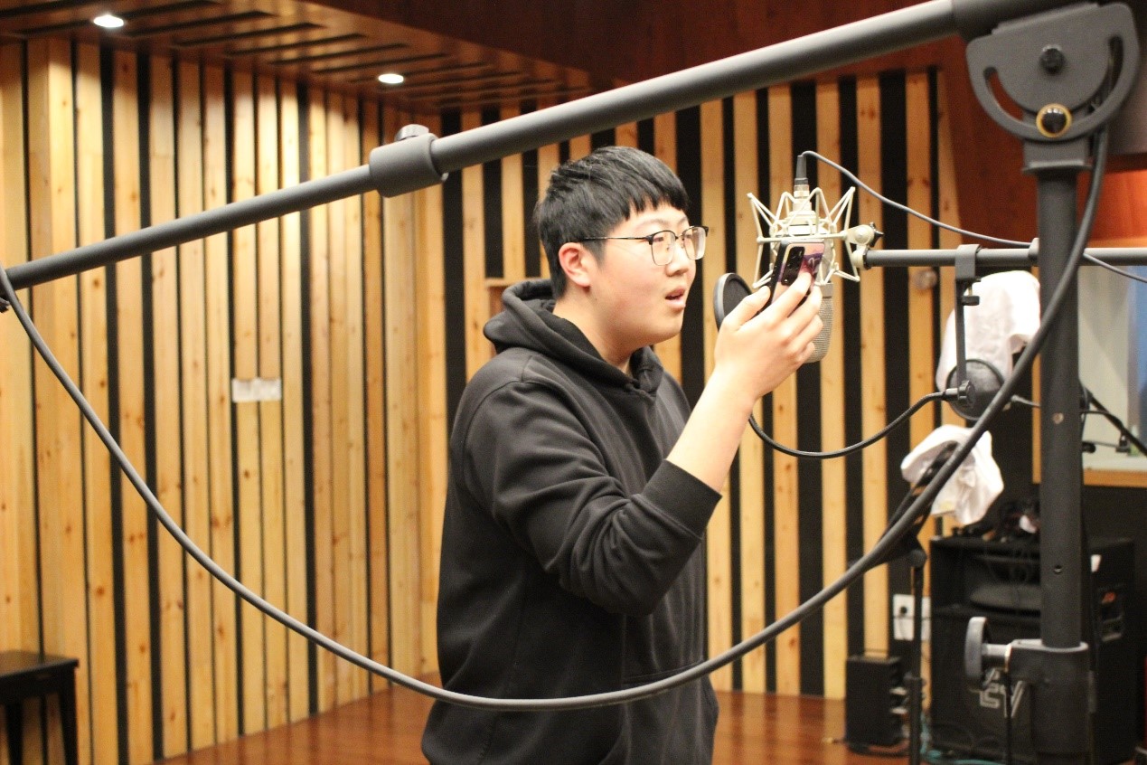 录音棚,深入浅出地介绍了棚中的设备及其运行过程和工作原理。他指出,录音棚最大的特点是安静,四周墙面和棚顶均使用了特殊的吸声材料。为使现场的声音均匀,录音棚的棚顶被做成特殊的散射体。参观过程中,朱老师以幽默风趣的语言进行解答了同学们提出的各种问题。随即,2018级音乐系学生郗望现场演唱歌曲,协助朱老师展示录音棚的工作流程。最后,同学们在朱老师的指导下亲身体验在录音棚演唱。朱老师对他们的声音进行了专业的点评。