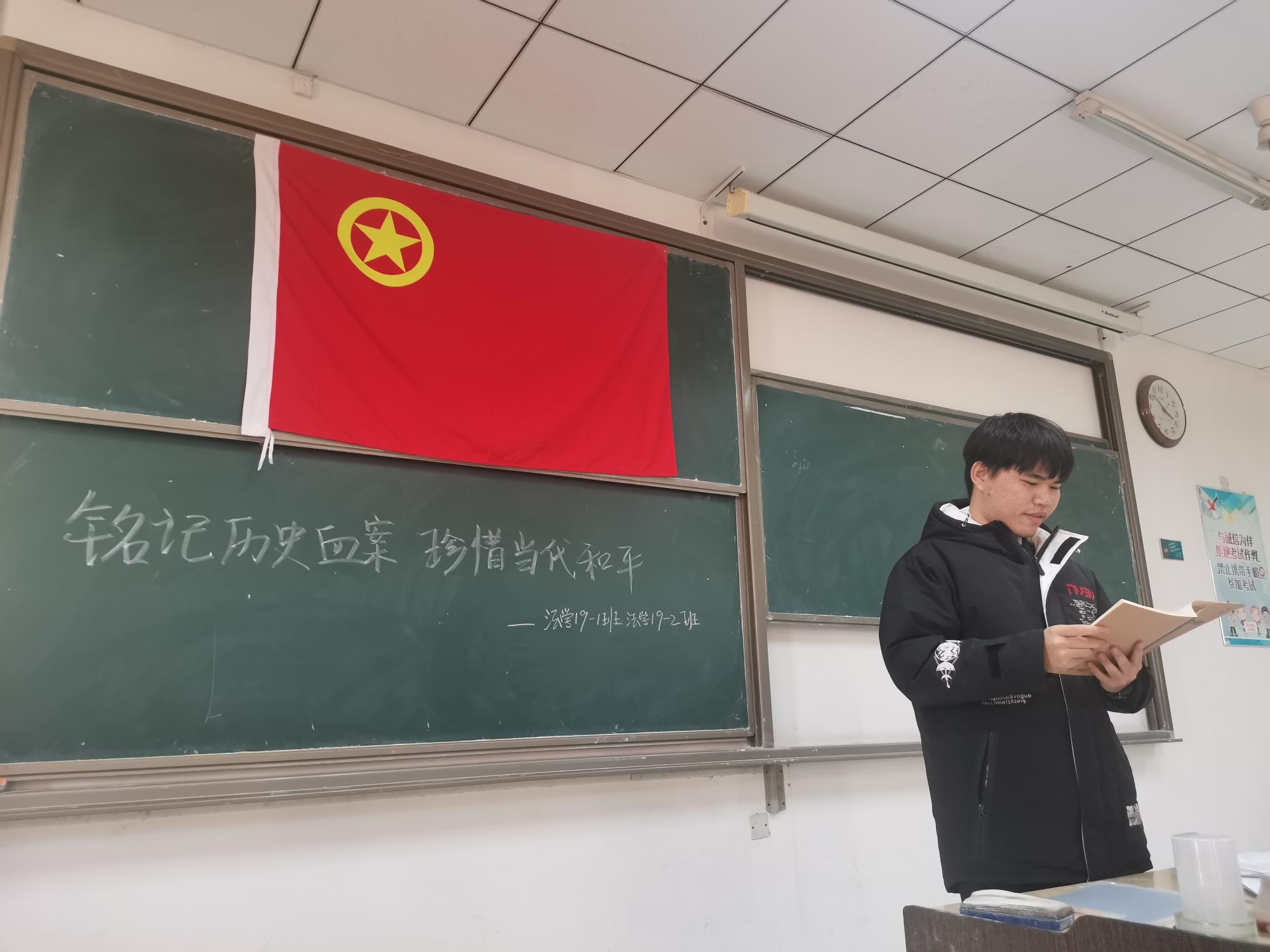 法学19-1班团支部与法学19-2班团支部共同于12月17下午4时在博三A303举办了“铭记历史血案,珍惜当代和平”主题团日活动。本次活动由法学19-2班团支书肖瀚峤主持,法学19-1班和法学19-2班全体成员参加。