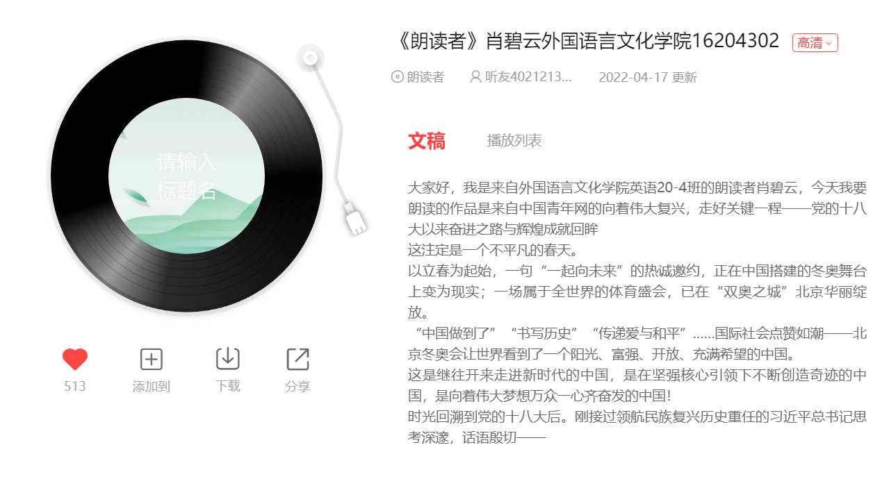 在活动负责人的积极宣传下,本次活动召集到了来自不同学院的志愿者们。本次活动采取线上形式,志愿者们选取、朗读展现过去十年以来中国日新月异变化的文章,并将音频上传至平台。活动结果由广播台专业人员与大众评审共同评定,共评出一等奖1名、二等奖2名、三等奖3名。