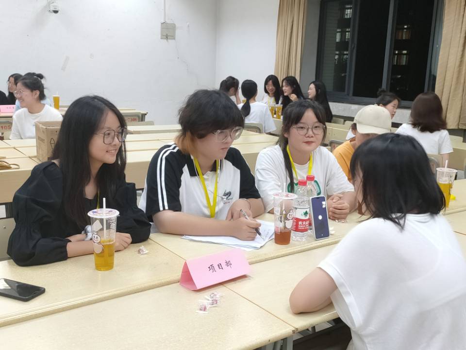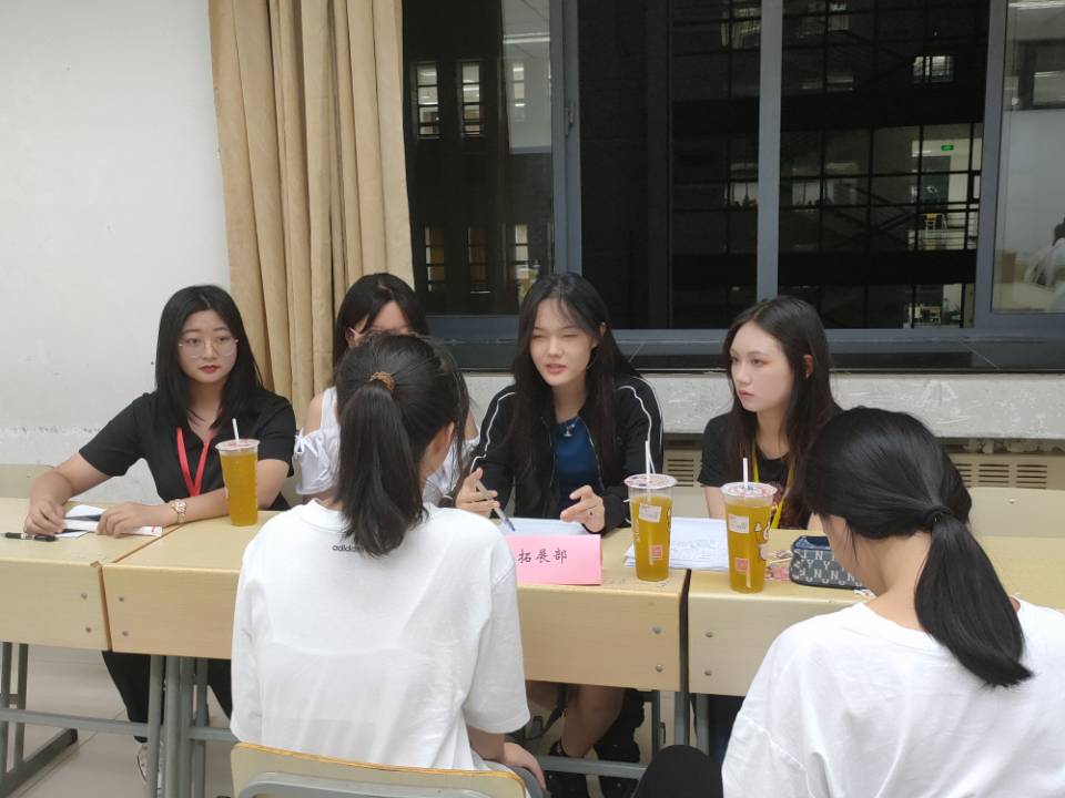 下午6时,招新活动开始后,新生陆续前往心仪的部门进行面试。面试过程中,学姐学长们认真地倾听前来面试的萌新们的自我介绍,并介绍自己部门的工作机制与优势特色。整个面试现场氛围轻松活跃。面试结束后,部门成员核对最后的名单,全体成员合影留念。