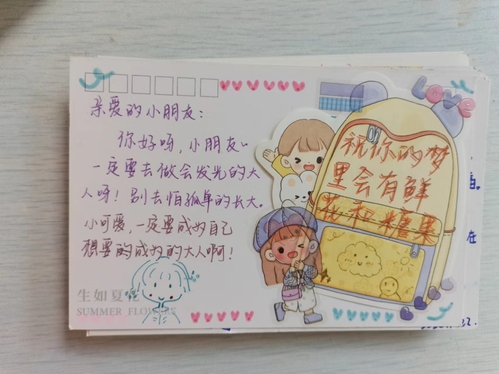 活动伊始,集中领取到明信片的志愿者们便着手创作,以书信的形式向留守儿童们慰以问候。写作过程中,一段段真挚的话语便跃然纸上,字里行间无不流露出对孩子们亲切的关怀。志愿者们又设计了充满创意的版面,绘出了一幅幅可爱的背景,这些都为原本朴素的明信片增加了别样风味。