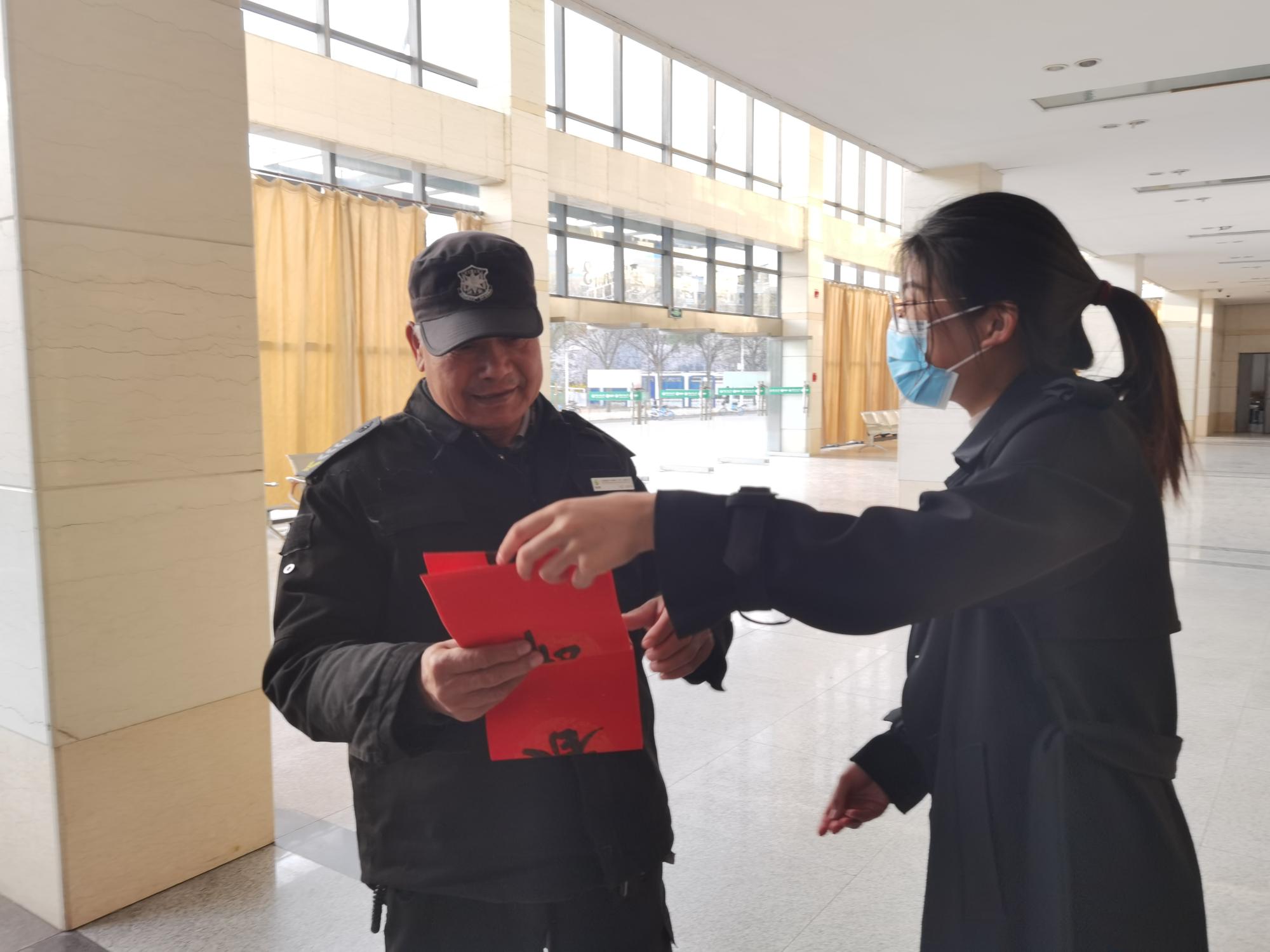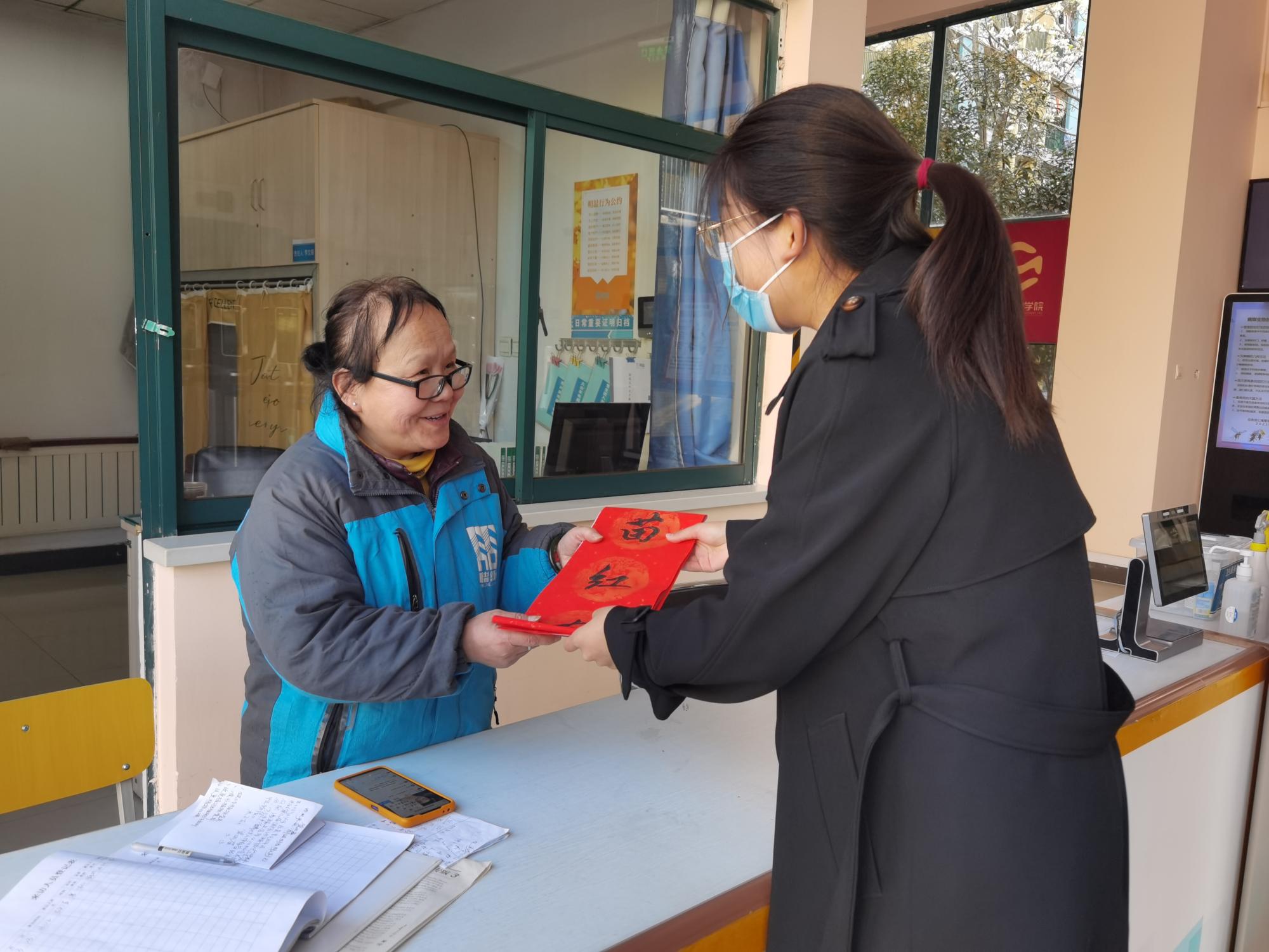 活动期间,志愿者们在完成报名后,通过剪纸、对联创作的形式向校工作人员和同窗好友传递关怀与温暖。纸张鲜红、墨香幽幽,渲染着浓厚的人文气息;一折一叠、一剪一裁,传递着真挚的美好祝愿。志愿者们制作出张张精美完整的窗花,一幅幅积极向上的对联,他们饱含真情,于黑墨红纸间感受笔墨丹青、指间乾坤的独特魅力。活动最后,主办方选出优秀作品赠送给在校工作人员,也将部分作品放置在宿舍楼下,学生自愿领取装饰宿舍。