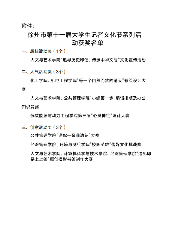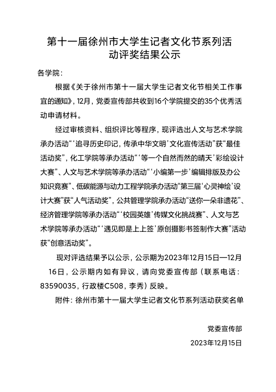 12月17日下午,第十一届徐州市大学生记者文化节闭幕式在信控学院报告厅举行。闭幕式上,学校公了布第十一届徐州市大学生记者文化节系列活动评奖结果,共评出“最佳活动奖”1项、“人气活动奖”3项、“创意活动奖”3项,麻豆av