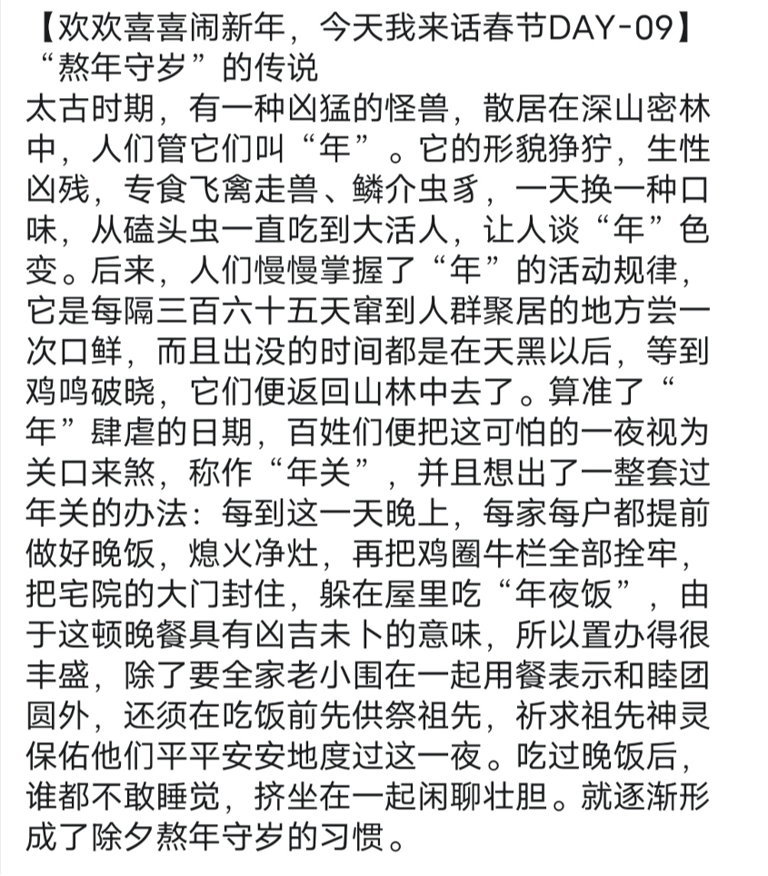 活动内容包括打卡说说、征集主题文章及实况推文。参与同学在线上平台发表说说,介绍当地新年习俗、传说故事,采用文章或推文形式展现独具魅力的新年文化、新春氛围。一段段精心编辑的说说,一首首真情流露的诗篇,一篇篇装满“乡愁”的推文,饱含深情的新春问候和温暖在同学之间传递。麻豆av