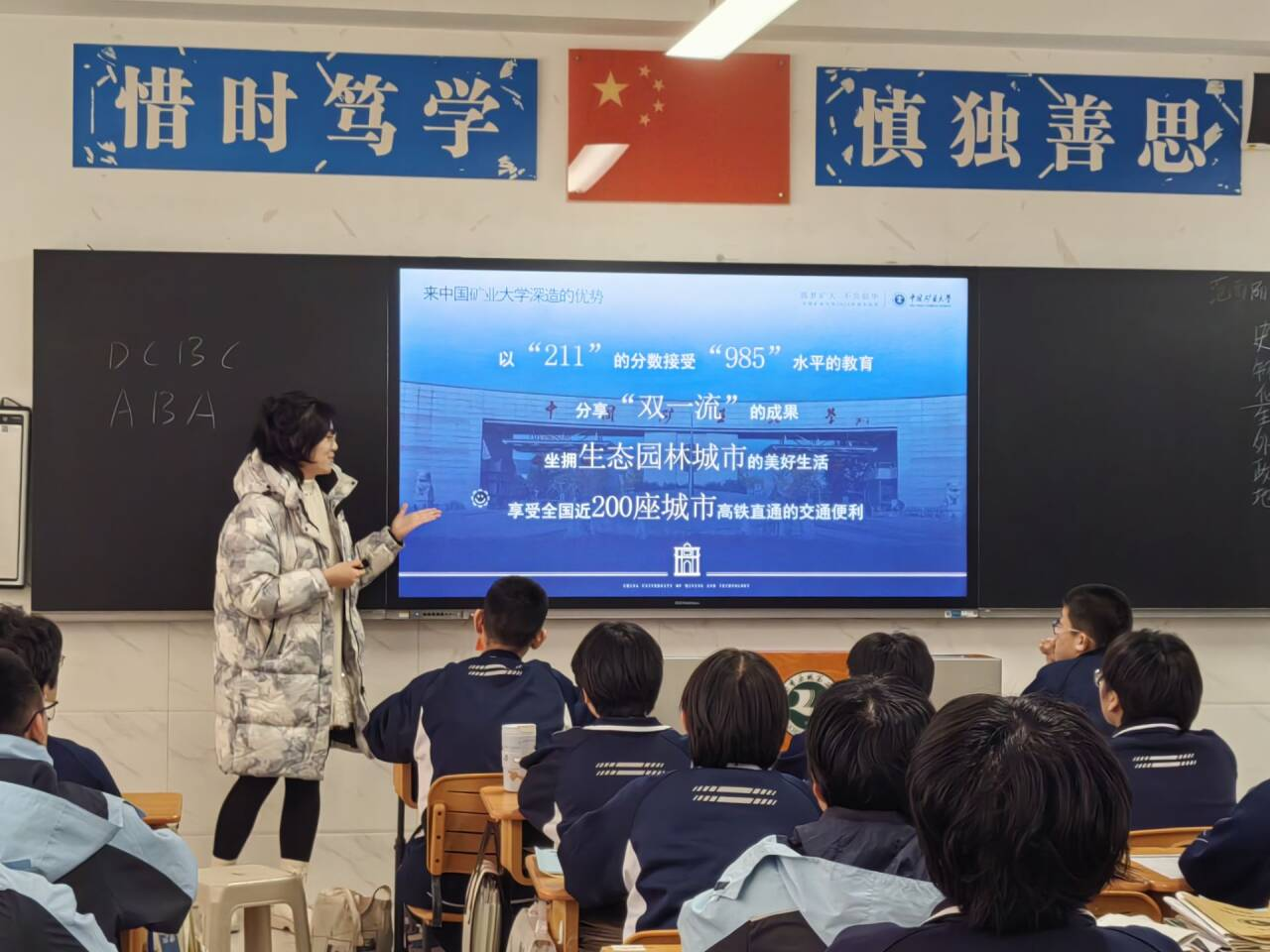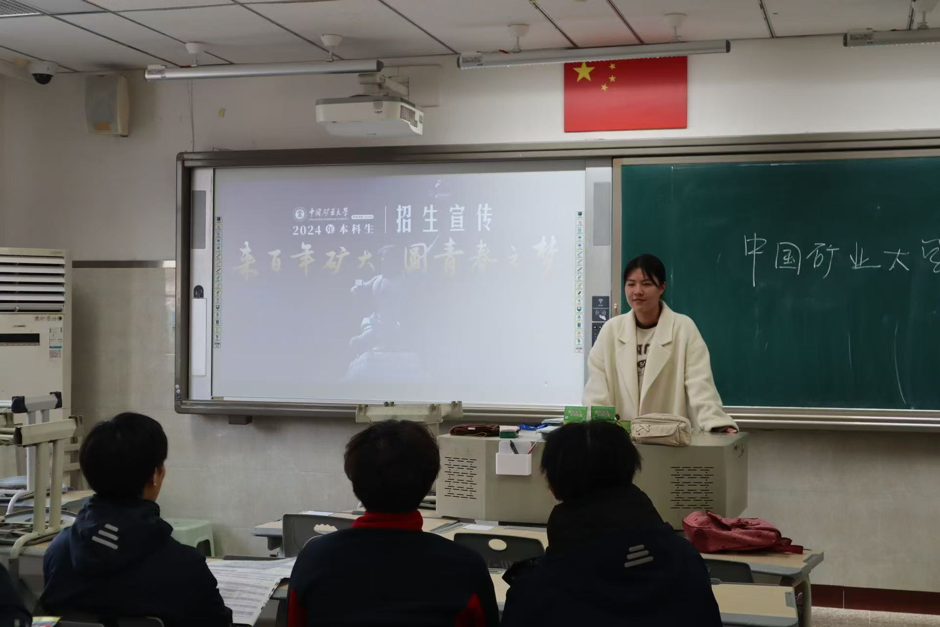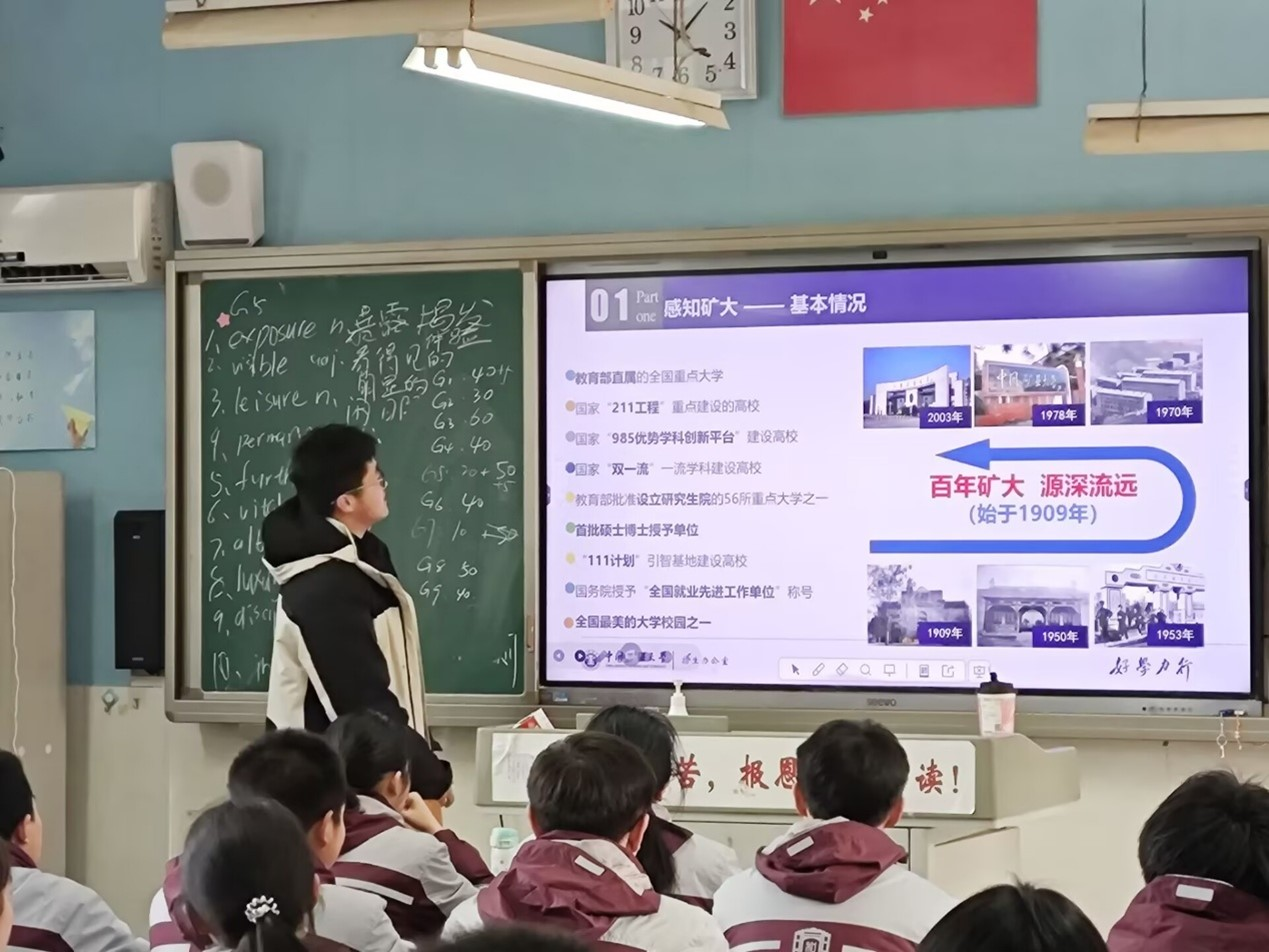 的办学特色、学科优势与校园文化。队员们播放矿大宣传视频、展示宣讲PPT,以生动画面与详实数据,呈现了矿大校园风貌、学术氛围以及学生活动。互动环节,学弟学妹们踊跃提问,内容涉及专业选择、学习方法、校园生活、就业方向等。此次活动让团队成员体悟了教育的力量与梦想的传承,促进了高中与大学交流合作,激发了母校学子的学习热情,也展现了矿大的独特魅力。