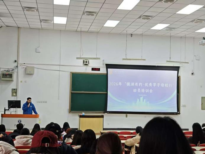 2026年“镜湖有约·优秀学子母校行”动员大会在博学2号楼C101召开。2025级辅导员、指导老师程金松及150余名学子参与会议。