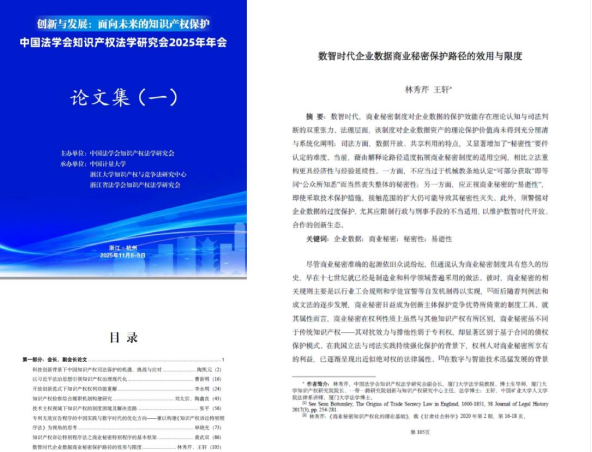 王轩与厦门大学教授林秀芹合作的《数智时代企业数据商业秘密保护路径的效用与限度》一文被年会论文集第一部分全文收录,并将在法律出版社出版;赵胤豪全程参与专题研讨,在学习前沿理论的同时展现了麻豆av