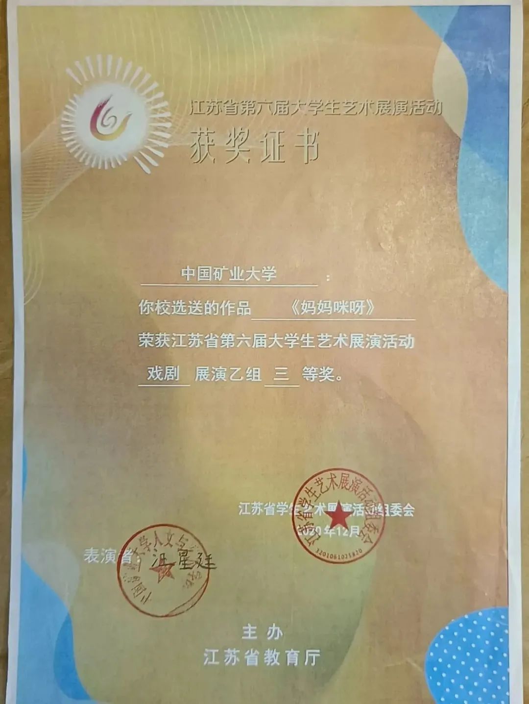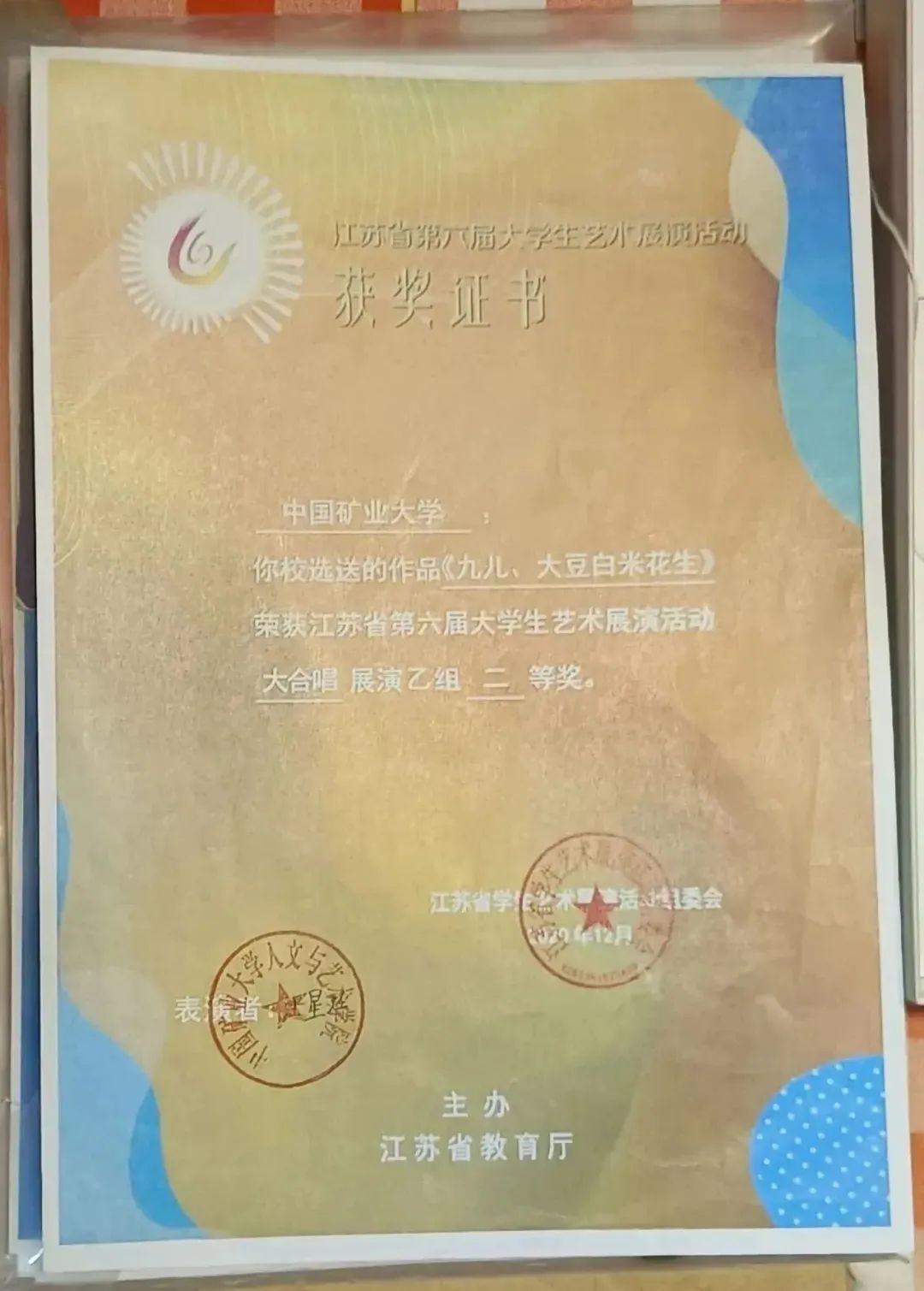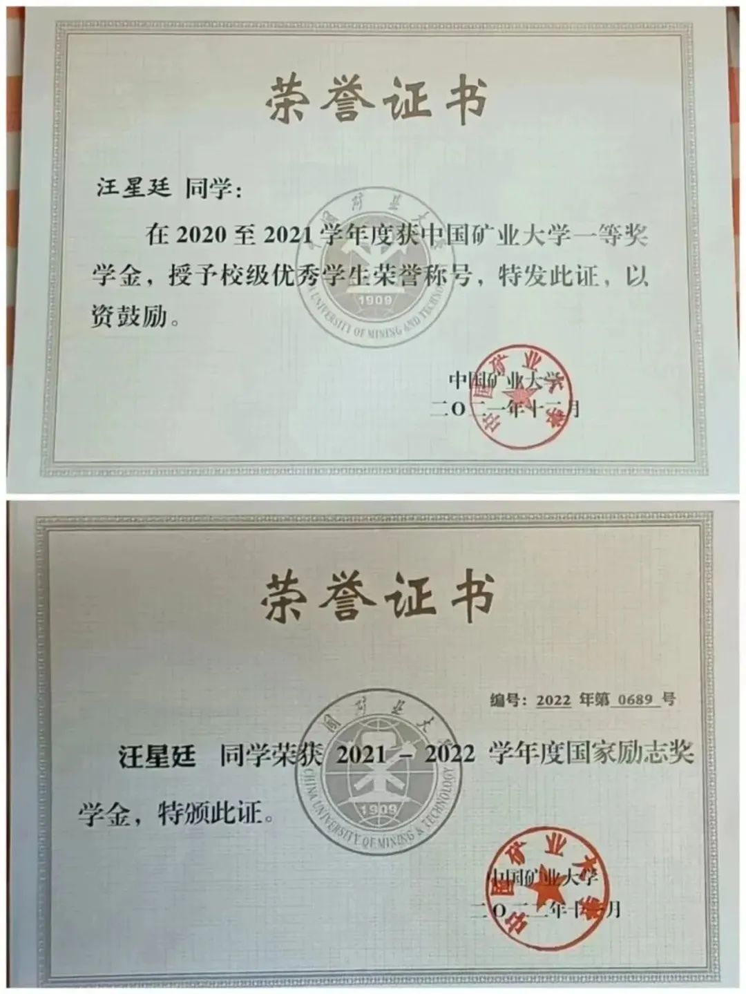 。连续两年成绩排名专业第一,获国家励志奖学金、校一等奖学金、校二等奖学金,江苏省第六届大学生艺术展演活动合唱组二等奖与戏剧组三等奖、徐州第六届钢琴音乐节“希望杯”钢琴比赛二等奖、“天声一对”情歌大赛一等奖等荣誉。