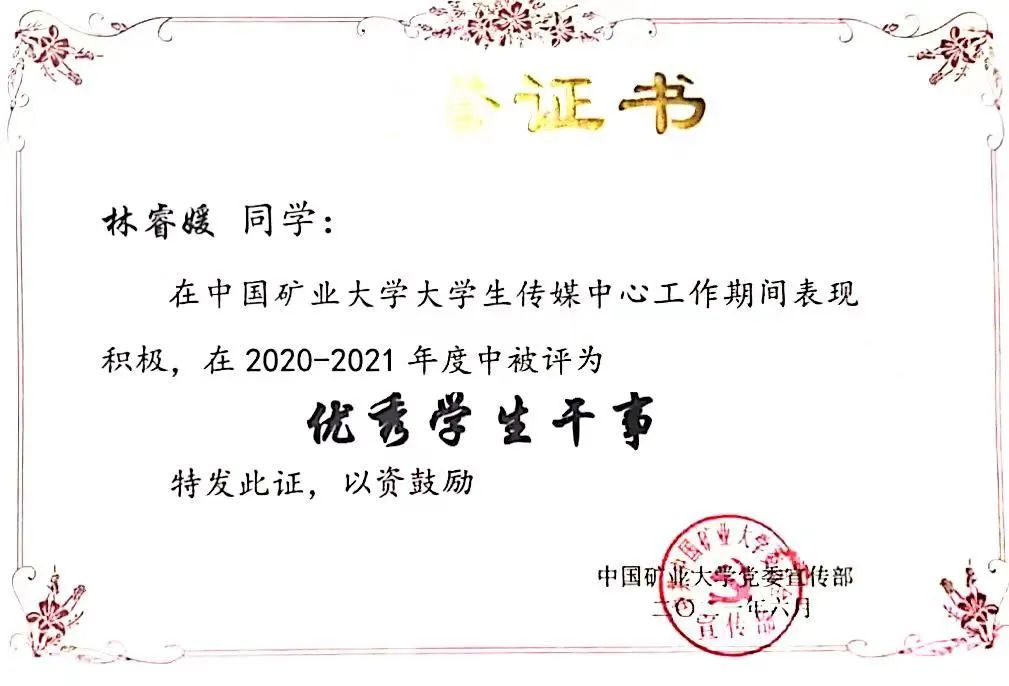 采访最后,回顾大学四年,林睿媛分享了她这一路走来的经验,“学习是大学期间最重要的事情之一,希望三年后自己依旧能保持自我,快乐每一天。”心中有光,不必为风雨叨扰,祝在今后的每一个三年里林睿媛都能爱她所爱,坚定前行。