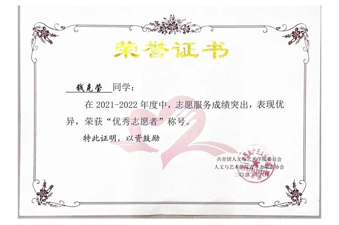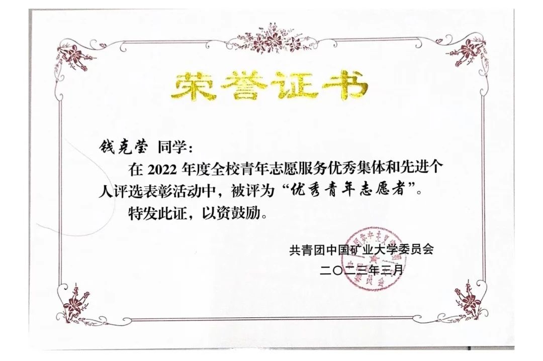 “做志愿的本身,其实是没有什么困难的,只要怀抱一颗真挚的心,付诸行动”,谈及本科期间所完成的志愿活动,钱克莹眼中依旧闪耀着光芒。在青年志愿者的实践活动中,“奉献、友爱、互助、进步”的精神让她的思想品行与自身素质得到了提高。