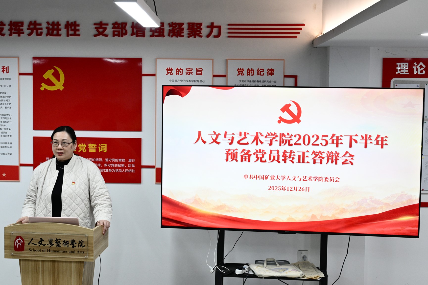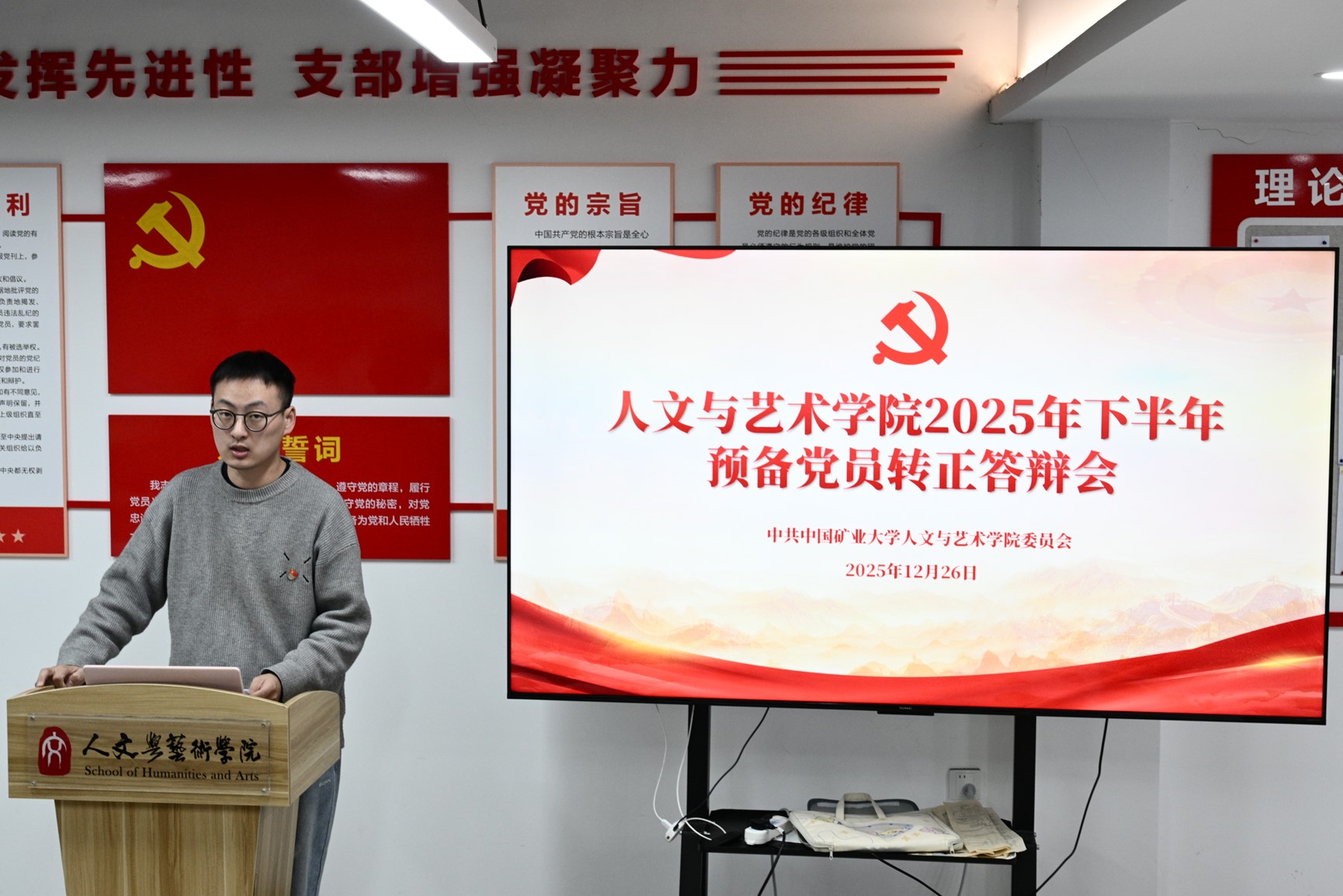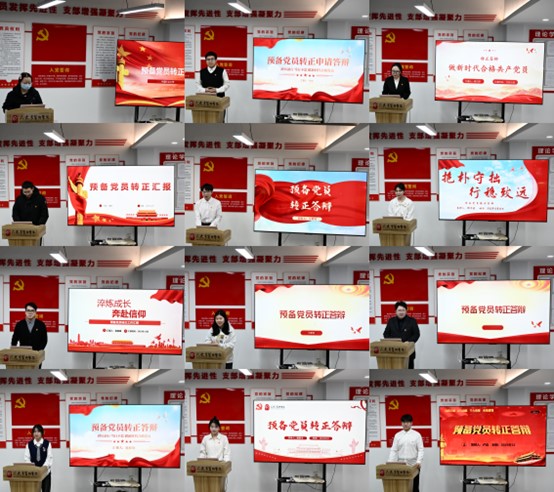 答辩会按自我陈述、评委提问、转正代表发言、重温入党誓词、党组织负责同志总结五个环节有序开展。13名预备党员依次汇报个人基本情况、入党动机及对党的认识;评委组围绕政治思想、学业工作、志愿公益、未来规划等维度提问,深入了解其思想动态与实际表现。转正代表袁嘉晟发言并领誓,全体人员重温入党誓词。姜媛副书记对答辩成效予以肯定,寄语转正党员牢记入党初心,以先锋模范标准严格要求自己,将个人成长融入时代发展,在学业科研与社会实践中践行党员使命、勇担青年责任。