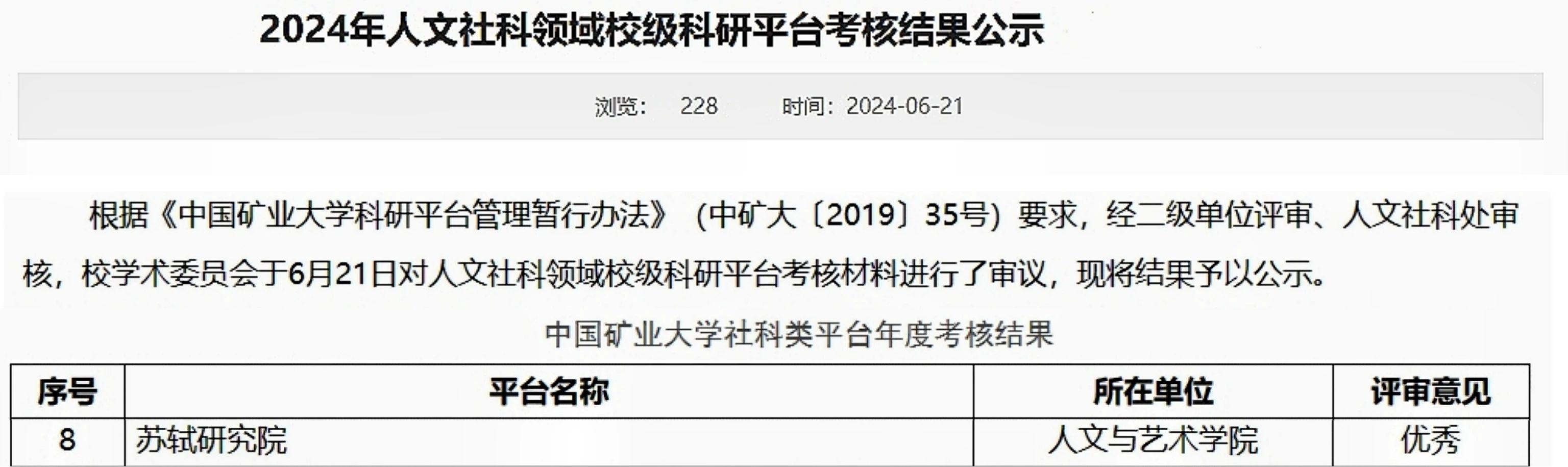 近日,经二级单位评审、人文社科处审核,校学术委员会对人文社科领域校级科研平台考核材料进行了审议,苏轼研究院考核结果为“优秀”。