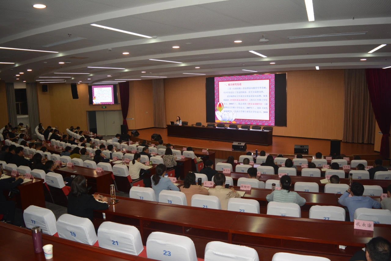 “一门父子三词客,千古文章四大家。”苏氏父子三人占了中国古文八大家三席之地,成就斐然。闫教授从三个角度谈三苏家教家风传承。首先是程夫人和苏洵的言传身教。程夫人的言行在潜移默化中培养出轼辙兄弟勤奋读书,正直处事,忠贞不屈,廉洁居官的性格。司马光《程夫人墓志铭》赞曰:“贫不以污其夫之名,富不以为其子之累;知力学,可以显其门;而直道,可以荣于世。勉夫教子,不愧为古代一贤母!”苏洵对儿子关切了解,同时也是责子以严的严父。苏轼《惊梦》中写道:“夜梦嬉游童子如,父师检责惊走书。计功当毕《春秋》余,今乃始及桓庄初。怛然悸寤心不舒,起坐有如挂钩鱼。……”苏轼梦到自己儿时贪玩,父亲和老师来检查功课,吓得他立马拿起书来读,原本计划当天要读完《春秋》,结果现在才读到桓公、庄公部分,还不到全书的三分之一。他从梦中惊醒,惊惧不已,坐起来感觉就像挂钩鱼一样焦虑不安。苏洵对二苏的严格要求可见一斑。苏洵有十年未再出游,他一面刻苦专研,著书立说,一面以其所学亲授二子,希望他们“能明吾学”。苏洵藏书数千卷,亲自整理校正,并对二子说:“读是书,内以治身,外以治人,足矣!”读书的目的是把自己培养成德才兼备之人,注重教育二子要研究“古今成败得失”。其次是苏轼与苏辙患难与共、彼此成就。苏轼视苏辙为挚友:“我年二十无朋俦,当时四海一子由” 。(《苏轼诗集》卷三十五 )苏辙:“手脚之爱,平生一人” 。(《栾城后集》卷二十)苏辙敬兄长为师:“抚我则兄,诲我则师”。(《亡兄子瞻端明墓志铭》)苏轼临终时,要苏辙把他葬于嵩山之下,并为他作《墓志铭》。知子瞻者,子由也。苏辙所作的《亡兄子瞻端明墓志铭》详尽叙述了苏轼一生的事迹,高度评价了苏轼的文学成就。这是宋代第一篇对苏轼生平作系统论述的文章,为研究苏轼生平提供了最原始、最权威的资料。第三是二苏和陶诗中对子侄辈的关爱、教诲。和陶诗作为苏轼晚年诗歌的重要代表,是诗人任扬州知州和贬谪岭海时集中创作的,共计124首,是他经历人生大起大落后思想和感情的自我升华与自然流露。苏轼和陶诗大部分与家人有着密切关系,诗人或作诗相赠,或要求其弟、其子侄唱和,体现出苏氏家族以诗歌为载体的独特家风传承方式。良好的家风家教使得眉山苏氏家族生生不息,后世子孙英才辈出,苏迈、苏过、苏迟、苏元老等皆青史留名。苏轼和陶诗家风传承最大的特色,就是以诗歌为载体,实现了内容与形式高度统一,既有家族思想启迪,又对文学创作问题进行探讨,既体现出苏轼家族的治家智慧,又突出了文学家族诗文传家的特点。讲座的最后部分,闫教授在讲述三苏家教家风对我们的当代启示时提到了三个关键词:“爱”“体验”和“创造”。这“爱”包括父母之爱、兄弟之爱与关爱后辈,苏氏家教家风由父母手足子侄之爱推广至人间大爱,苏轼、苏辙兄弟为官以民为本,关心民生,造福百姓,遗爱千载。这“体验”既有亲人离别,又有宦海浮沉与精神升华。人生的历练有助于个体生命的成长。正如苏轼诗云:“问汝平生功业,黄州惠州儋州”,“九死蛮荒吾不悔,兹游奇绝冠平生”。这“创造”在于三苏为子孙后代、为人世间留下了诸多文学精品,熔铸了一座文化宝藏。其家风传承影响深远,其创新精神滋养着一代代中国人,启示着人们思考怎样过好这一生,让每一个寻常人的生命以多元的形态绽放。