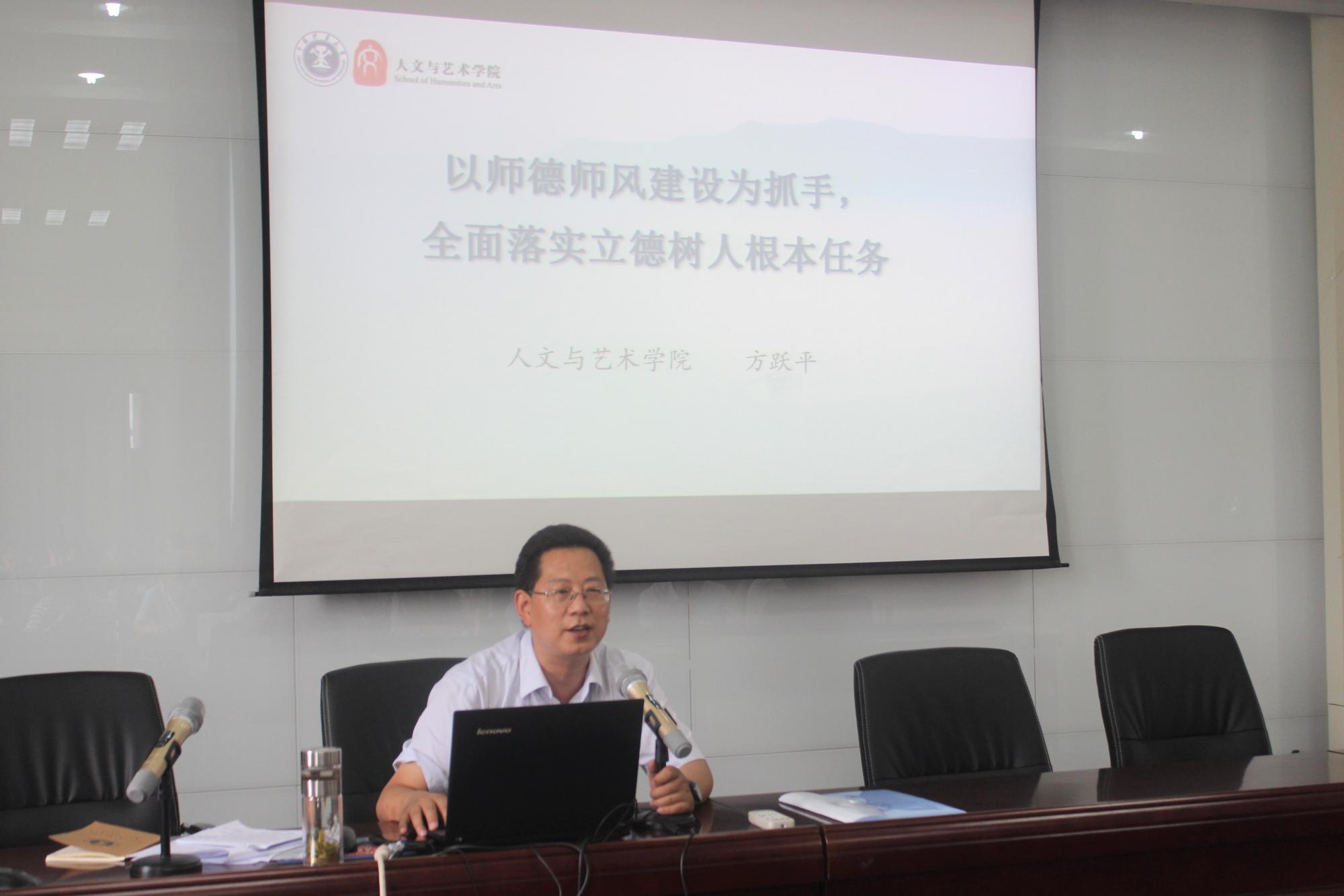 在文科楼A501进行了“师风师德建设”主题党课。此次党课由院党委书记方跃平主讲,院长史修永主持。
