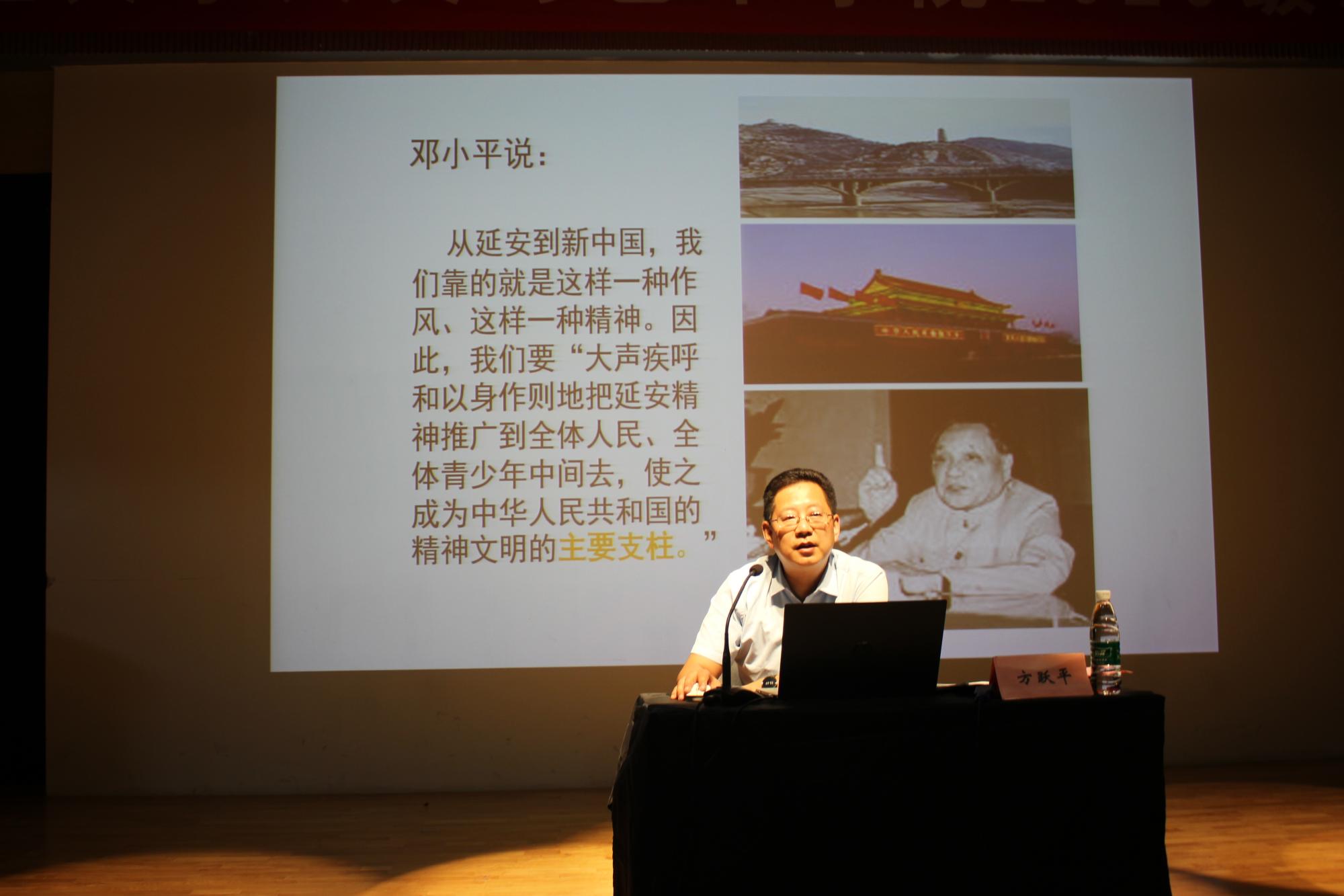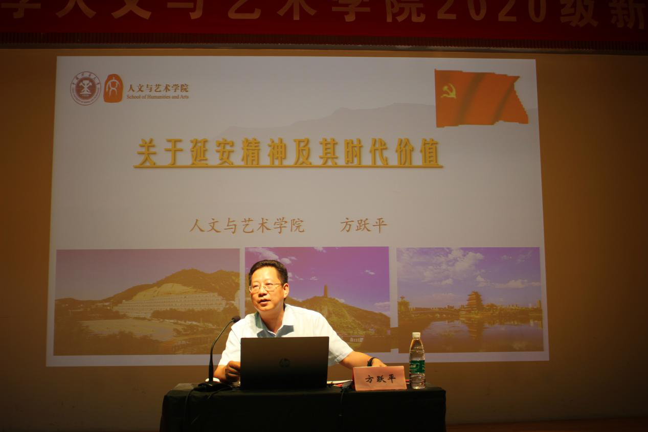 9月16日下午,人文学院党委书记方跃平在艺术报告厅为2020级本科新生讲授题为《关于延安精神及其时代价值》的开学第一课。