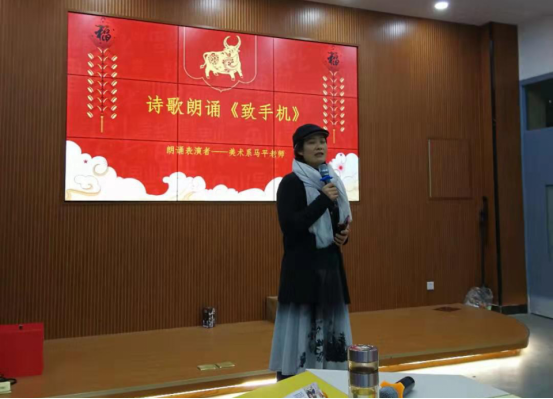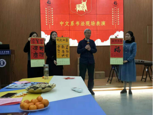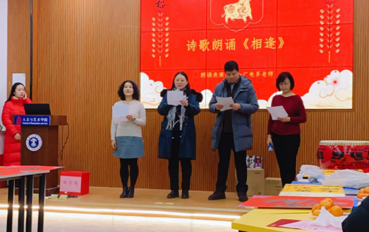 教职工新年联欢会第二阶段的娱乐环节,由刘子昱、刘艺超两位老师主持。音乐系四位学生首先登场,一首合唱向老师们致以节日的祝福;接下来,法学系黄红宇老师表演了独唱节目《请到这里来》,院机关全体职工在李广文副院长的带领下表演了小合唱《明天会更好》,广电系教师王青教授等表演了诗朗诵《相逢》,美术系教师马平推出了原创诗歌朗诵《致手机》,中文系高淮生教授现场进行了书法展示。整个活动期间欢歌笑语不断,洋溢着浓郁的节日氛围。老师们的精彩节目和优秀才艺,获得在场观众的热烈掌声。