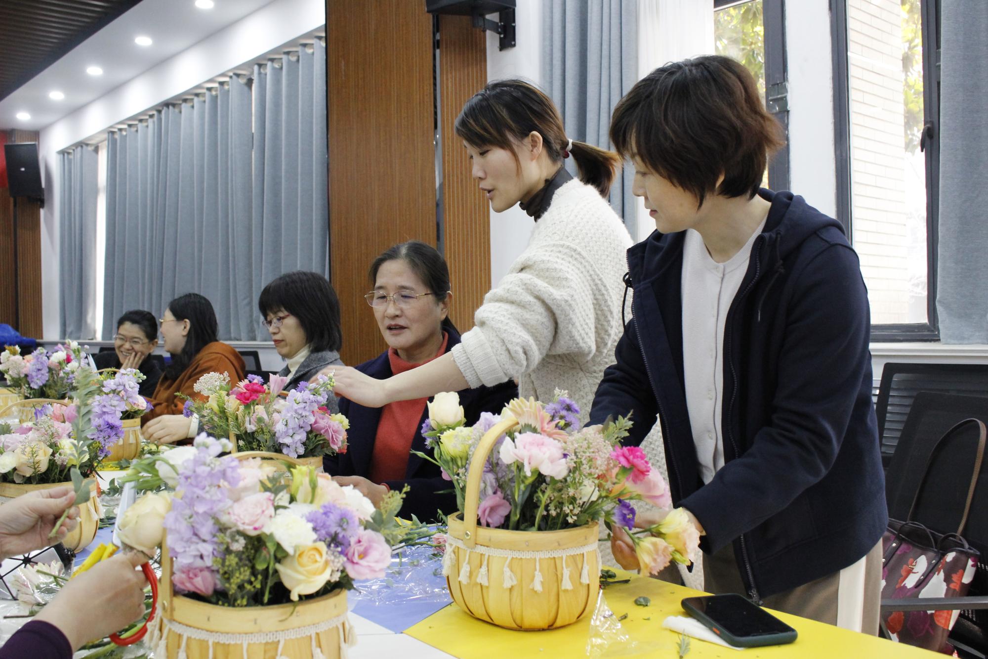 的花艺师进行插花知识的讲解。花艺师首先介绍了插花的基本技巧,接着老师们亲自动手插花完成花篮艺术品。她们一边插花一边聊天,相互借鉴、相互学习,用自己灵巧的双手,将原本普普通通的花草,修剪、整枝,根据不同的颜色、角度、高低整合到一起,形成了一个个独具匠心又饱含深意的小花篮。活动结束后老师们与各自的花篮合影留恋,留下美好的回忆。