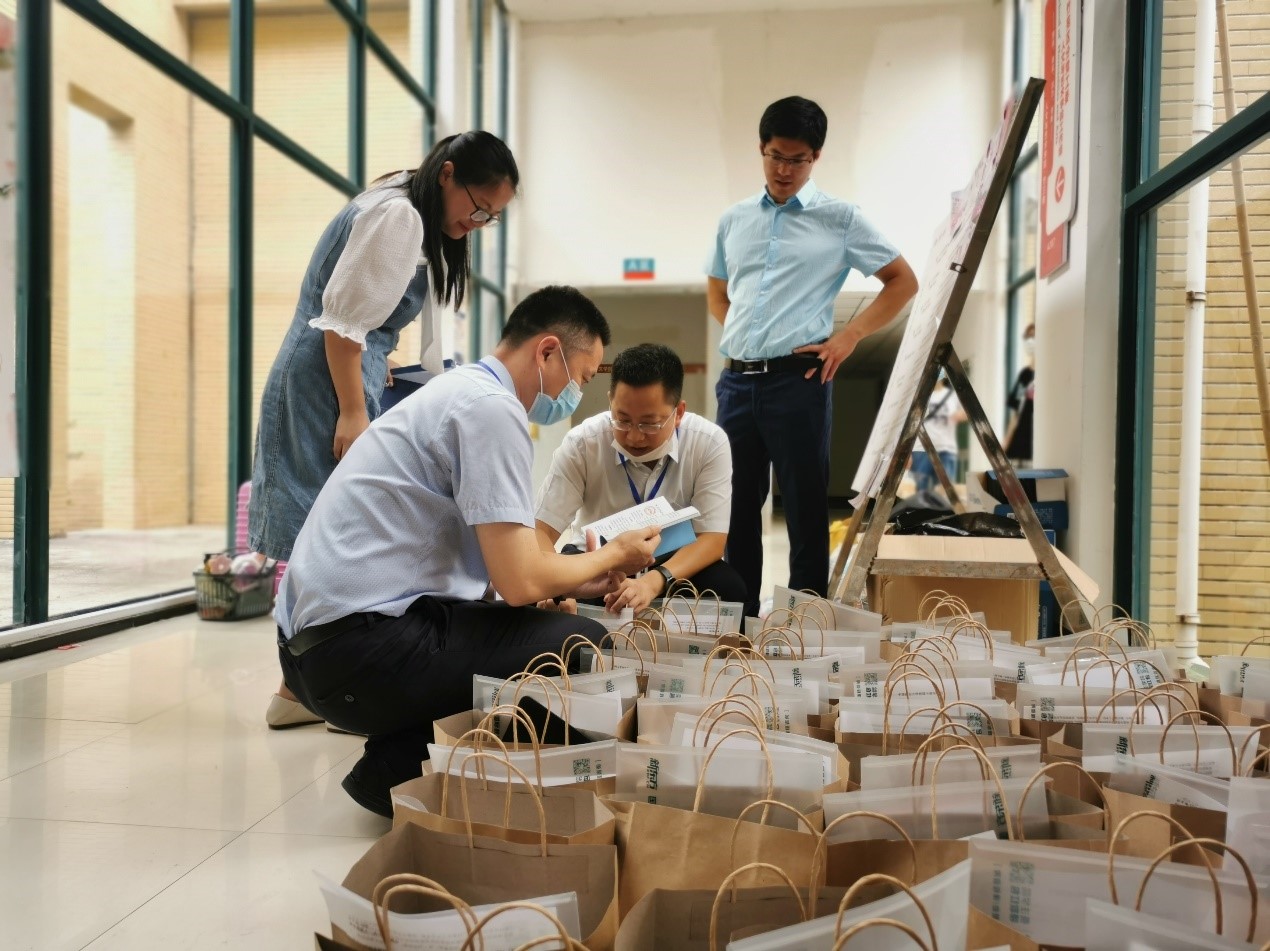 图二:方跃平书记、史修永院长、丁恒星副书记查看学院为新生准备的学习用品