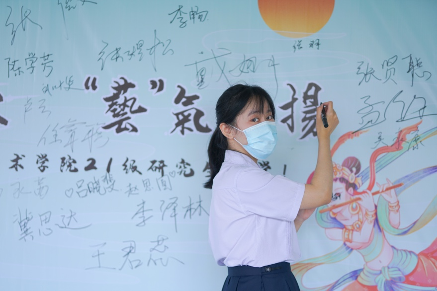 对本次开学迎新工作进行了精心策划,突出人文艺术特色,为新生准备了精美的书签和签名墙。每一名研究生新同学都收到了一份写有自己名字的书签,此书签由辅导员杨安华亲笔书写,体现了对新生们的关爱。签名墙则以“文”讯而至,“艺”气飞扬八字为题,融入多种传统文化元素,留下了每位新生的入学欣喜,也表达了学院对新生的欢迎和重视。