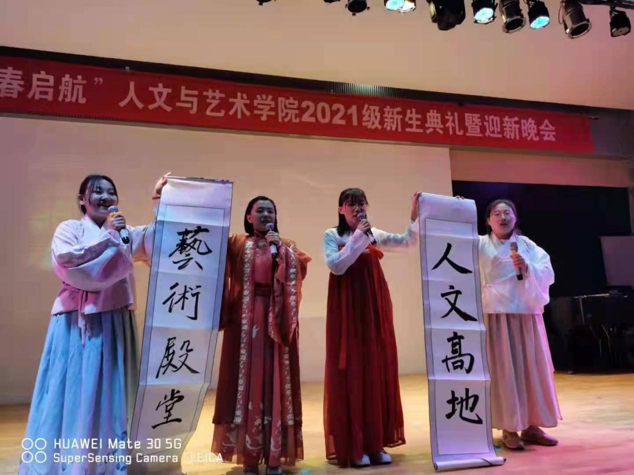开学典礼环节在同学们热烈的掌声中落下帷幕。迎新晚会在同学们热切的期盼中开始。四位“校园十佳歌手”以合唱《第一天》开启了欢乐的乐章;同学们朗诵的《红船,从南湖起航》、《何为青年,青年何为》充满了浓郁的家国情怀,触人心弦、发人深省;腾玥同学的《在夜里跳舞》歌声空灵、富有穿透力;歌曲串烧和舞蹈《hip》让大家感受了大一新生的青春活力与多才多艺;门星龙、刘志贤两位同学的朗诵《解忧》诠释了对父母深深的爱意。音乐系学生民乐合奏《金蛇狂舞》、《我的祖国》,旋律优美,气势宏大,引来阵阵掌声。