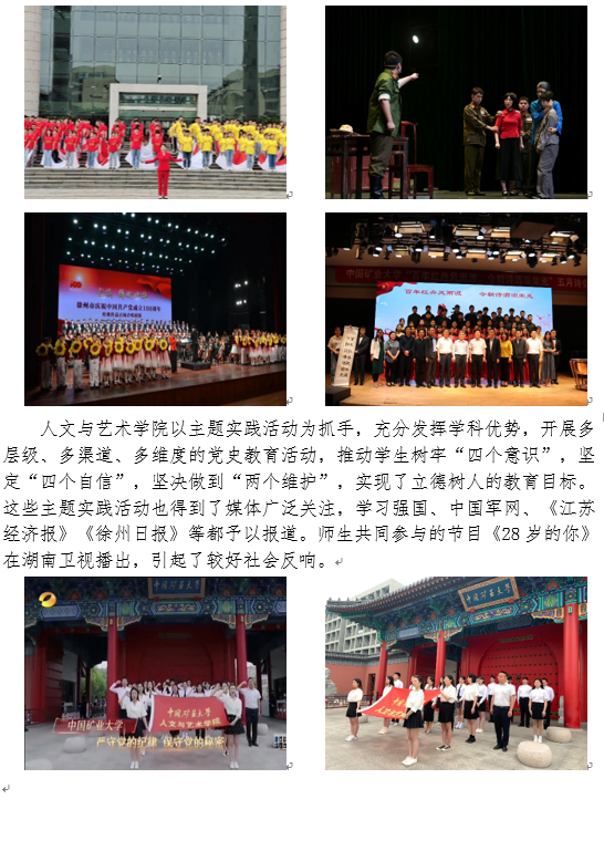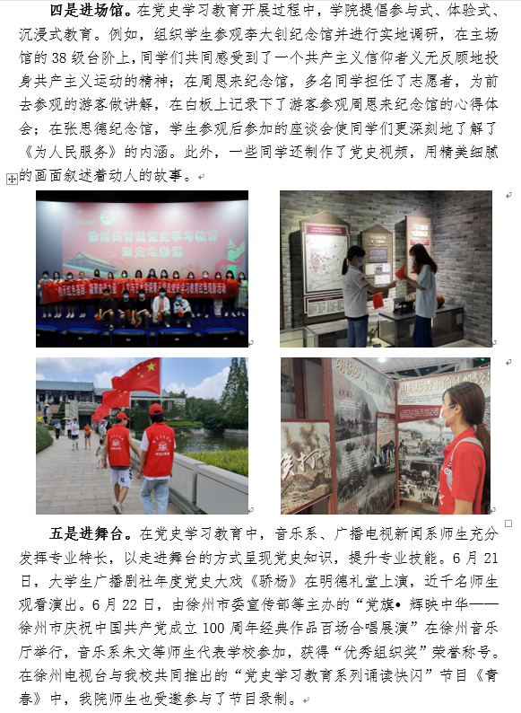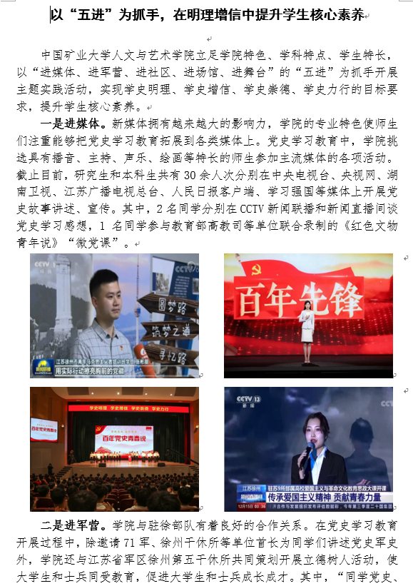 立足学院特色、学科特点、学生特长,以“进媒体、进军营、进社区、进场馆、进舞台”的“五进”为抓手开展主题实践活动,实现学史明理、学史增信、学史崇德、学史力行的目标要求,提升学生核心素养,取得了显著效果。