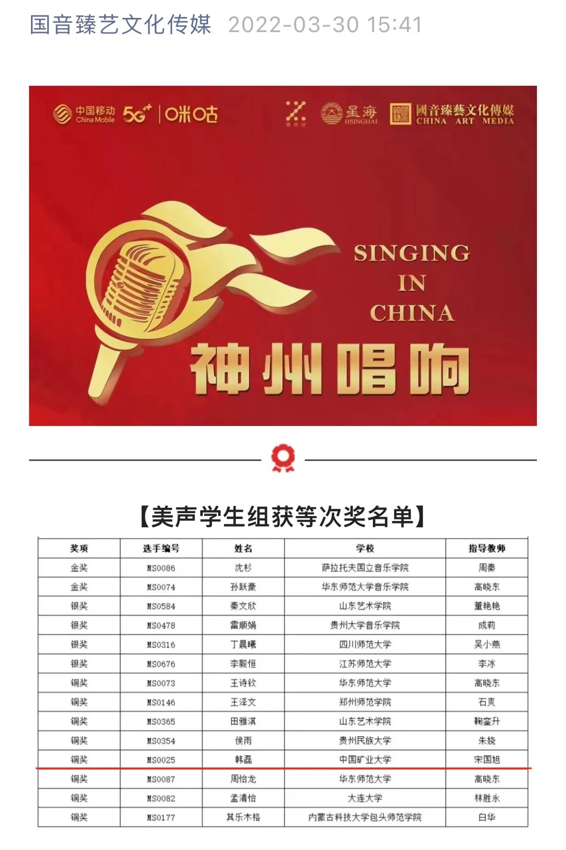 因疫情防控需要,比赛通过线上选拔。经过晋级赛、半决赛最后至全国总决赛,韩磊同学凭借其扎实的基本功、出色的发挥、稳健的风格,最终排名美声组全国第11名,荣获铜奖。