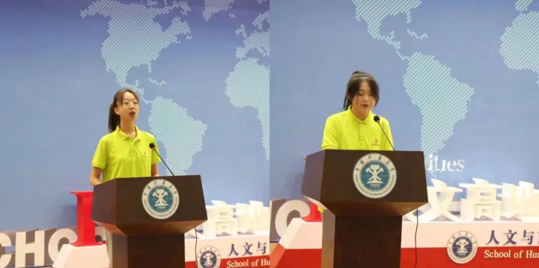 中文22-1班李涵、音乐22-1班龚恋婷代表新生发言。她们表达了考入矿大人文学院的激动和自豪之情,并期待在人文学院老师的指导下,在自己的摸索与拼搏中,未来的四年学习生活能够充实而美满,为实现中华民族伟大复兴贡献出属于自己的力量。