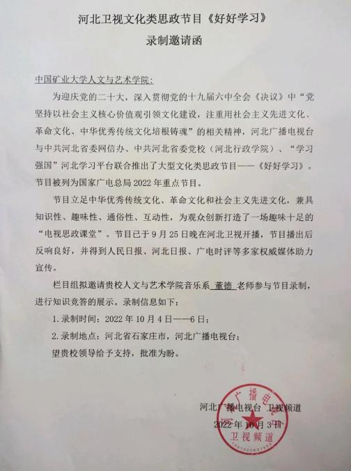 由河北广播电视台、中共河北省委网信办、中共河北省委党校、“学习强国”河北学习平台联合制作的文化类思政节目《好好学习》近期在河北卫视播出,人文学院音乐系董德老师受邀第十期节目录制,积极答题并领唱《我的祖国》,对学校及学院做了宣传推介,河北新闻联播、新浪新闻等媒体平台相继进行了报道。