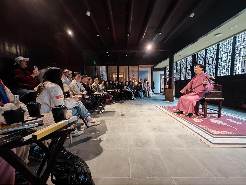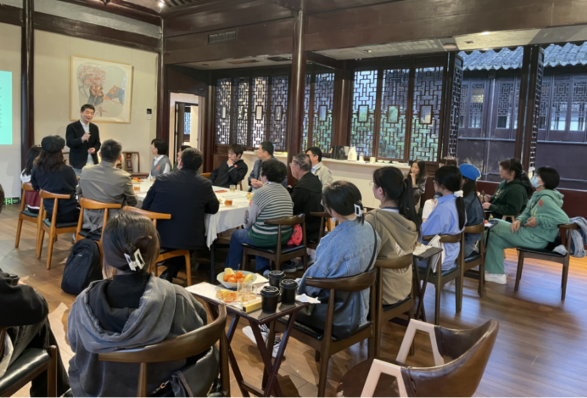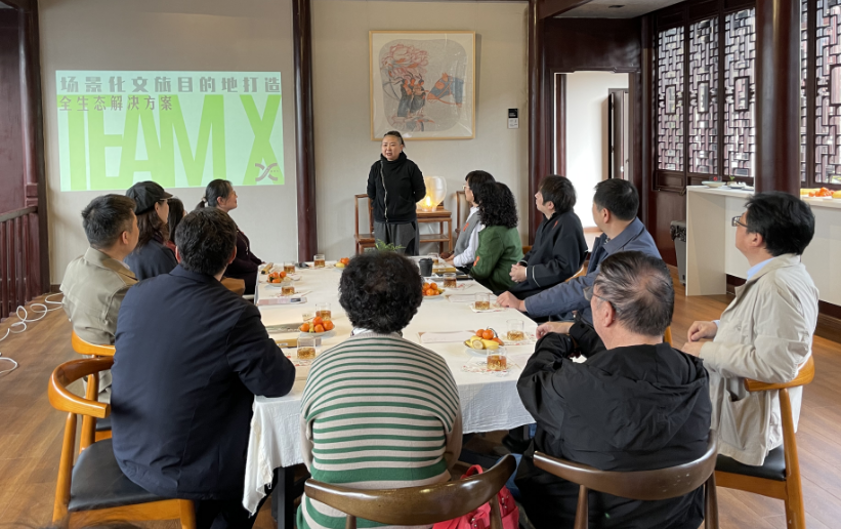 演出结束后,由Team X萧剧场发起人、山塘浮生集主理人萧雁博士详细介绍了沉浸式昆曲体验和互动式文旅体验等文创产品创意开发的情况,重点介绍了特色文旅项目浮生六记园林版、双塔市集项目策划及Team X企业数字创新的探索,与会师生针对文化旅游创新、数字文旅、打造旅游目的地、学科建设征求意见建议等课题进行了深入交流。