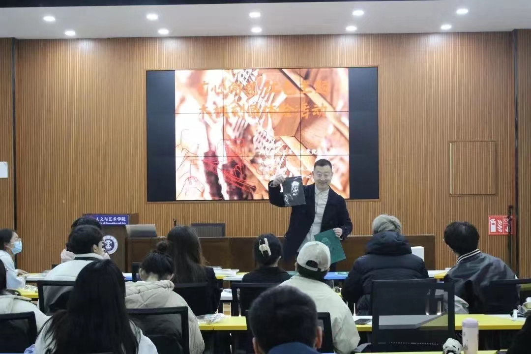 王磊老师向同学们介绍了木刻版画的“前世今生”,我国复制木刻版画已有上千年历史,新兴木刻版画则起自20世纪30年代,经鲁迅提倡,成为一股崭新的革命美术创作潮流。在抗战洪流中,艺术家们将版画艺术作为战斗的武器,在思想教育引导方面发挥了巨大的作用。王磊老师带领大家赏鉴了《“九一八”日军侵占沈阳城》《到前线去》《彭德怀将军在抗日最前线》等经典木刻版画,体味中国现实主义艺术创作“扎根人民、扎根生活”矢志不渝的追求和源源不断的艺术力量。