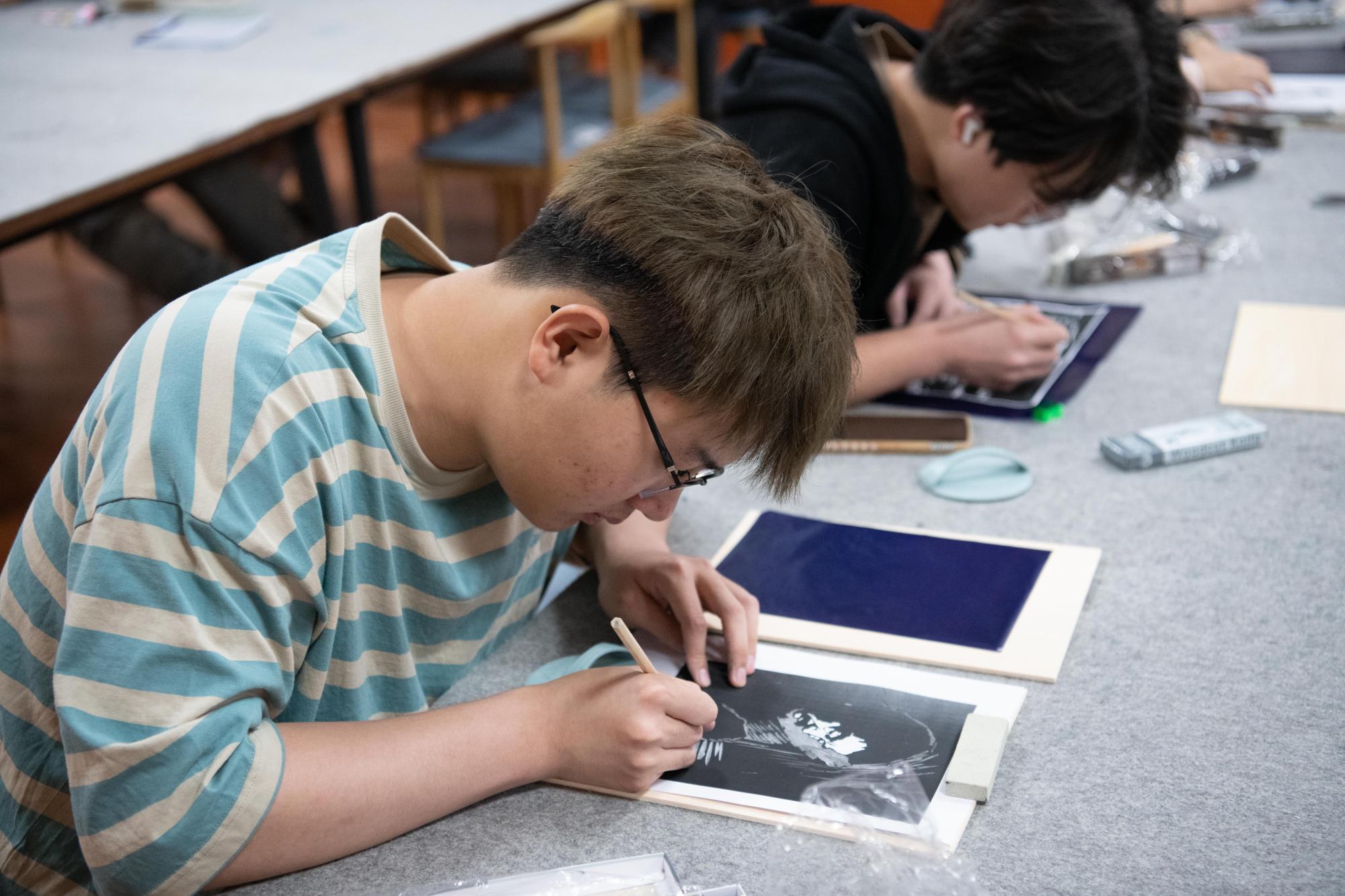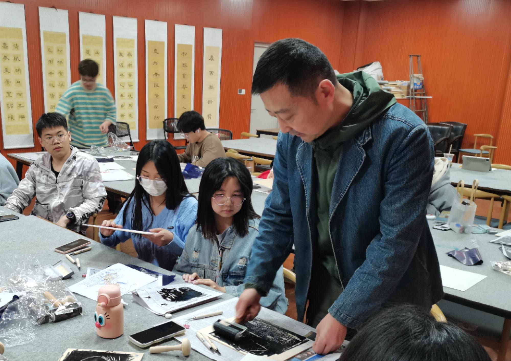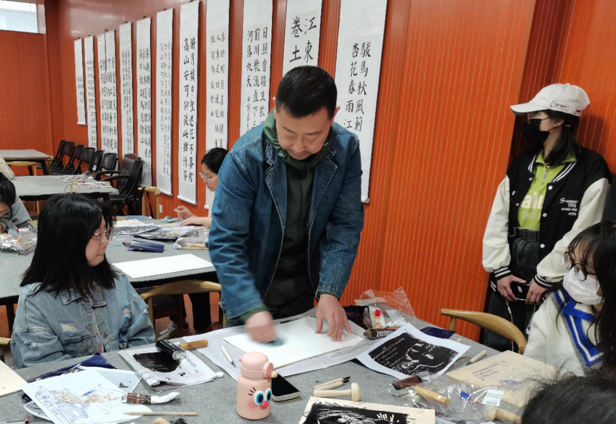 随后,王磊老师指导同学们进行实践体验。同学们在老师的指令下进行绘制、雕刻和拓印。同学们固定好木板和纸,把提前准备好的图案拓印在木板上,然后用刻刀进行刻制。在新鲜的体验中,同学们都全神贯注地雕刻着自己的作品。