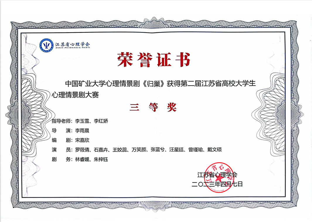 辅导员李玉雪和学校大学生心理健康教育中心教师李红娇共同指导、学院大学生心理自助中心精心组织编排的情景剧《归巢》代表学校参赛,在全省125件参赛作品中脱颖而出,荣获大赛三等奖。