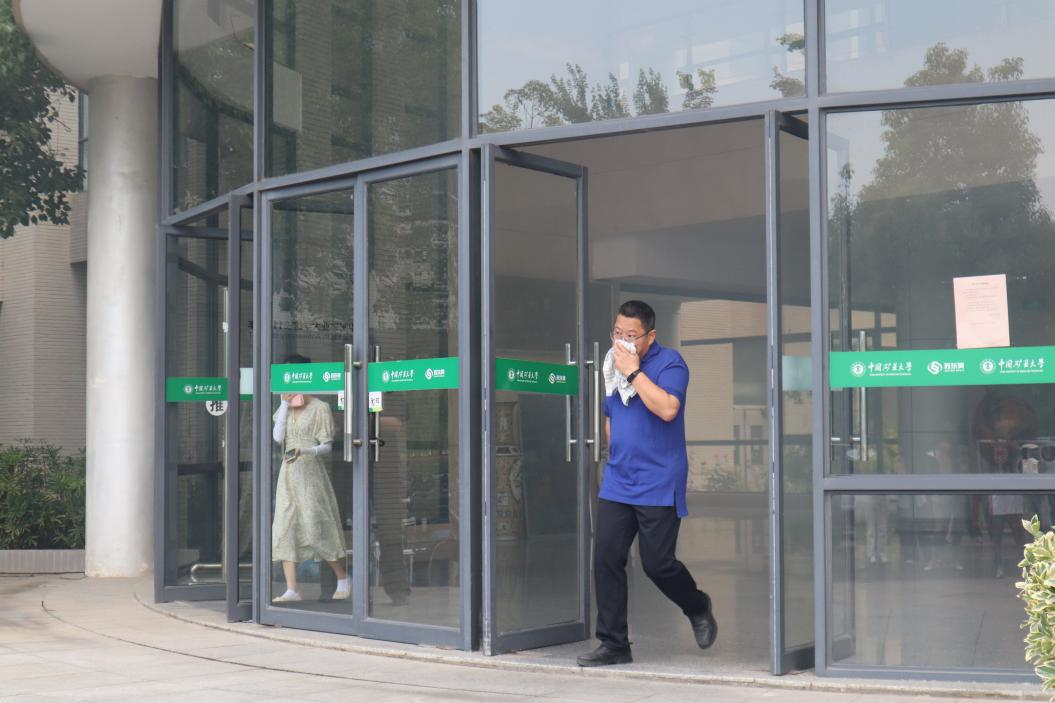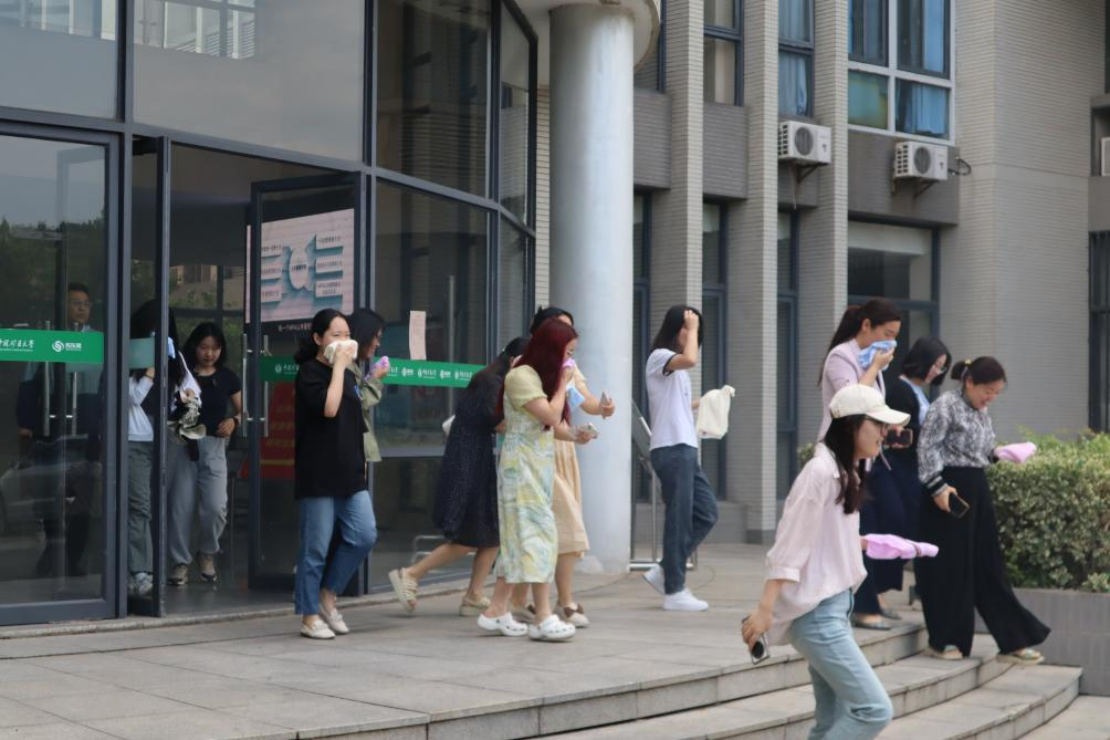 九点钟,消防演练正式开始。文科楼一楼大厅散发人工烟雾,模拟火情发生,老师和同学们用湿毛巾捂住囗鼻,有序跑出楼道,疏散至文科楼前空地。演练现场的师生们有效、迅速对火灾事故做出反应。