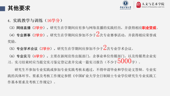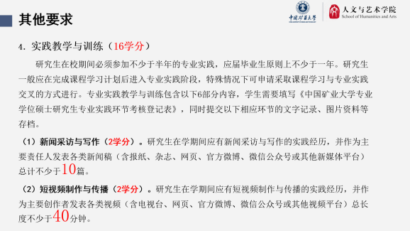 新闻与传播硕士专业学位研究生培养方案》。他首先明确培养目标——“新闻与传播硕士专业学位旨在培养具有扎实理论基础、较高媒介素养和高水平新闻传播技能,能够从事多种媒体专业工作的新型应用型新闻传播人才”。围绕“数字文化与媒介文化”“数字文旅与城市传播”“出版传播数字化研究”“煤炭工业出版史和传播史研究”等四个专业研究方向,曹洪洋老师介绍了课程设置、实践考核、毕设论文等毕业要求。他强调,通过培养方案的有效实施,同学们在毕业时都应也都将获得一份在本专业领域丰厚而出众的个人简历。他还表示,新闻传播学系正上下一心,积极开拓思路,整合校内外资源,不断创造更优越条件和更优质资源。通过培养方案的讲解,同学们对自己硕士研究生阶段的具体任务都有了明确认识。会议进行到晚十点半后才结束。